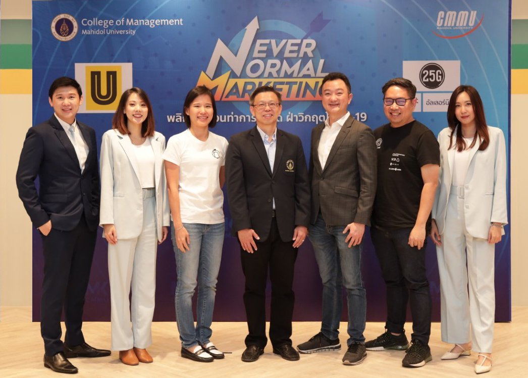 ดร.บุญยิ่ง คงอาชาภัทร ผู้ช่วยคณบดี และหัวหน้าสาขาการตลาด วิทยาลัยการจัดการ มหาวิทยาลัยมหิดล (CMMU) (คนที่ 4 จากซ้าย) พร้อมด้วยนักศึกษาปริญญาโท วิทยาลัยการจัดการ มหาวิทยาลัยมหิดล (CMMU) และผู้ประกอบการ ร่วมจัดงานสัมมนาการตลาด “Never Normal Marketing : พลิกกระบวนท่าการตลาดฝ่าวิกฤตโควิด-19” เผยผลงานวิจัยเกี่ยวกับผลกระทบจากวิกฤตโควิด-19 ต่อธุรกิจในประเทศไทย และ “กลยุทธ์การสร้างภูมิคุ้มกันให้ธุรกิจ” พร้อมแลกเปลี่ยนแนวคิดกลยุทธ์การปรับตัวทางการตลาด ทั้งนี้ กิจกรรมดังกล่าวจัดขึ้นเมื่อเร็วๆ นี้ ณ จัสโค ชั้น 5 อัมรินทร์ ทาวเวอร์ กรุงเทพฯ