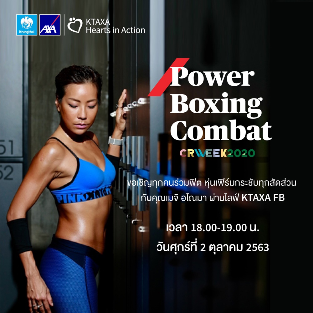 บมจ. กรุงไทย-แอกซ่า ประกันชีวิต ขอเชิญชวนทุกท่านเข้าร่วมกิจกรรม “Power Boxing Combat” มาฟิตหุ่นกระชับทุกสัดส่วนกับเทรนเนอร์สาวเฮลท์ตี้ คุณเมจิ อโณมา คุ๊ก กูรูด้านสุขภาพ และการออกกำลังกาย ที่มาเป็นผู้นำในการออกกำลังกายสุดสนุกในครั้งนี้ ผู้ที่สนใจสามารถเข้าร่วมกิจกรรมโดยไม่เสียค่าใช้จ่ายใดๆ ผ่านช่องทาง Facebook ของกรุงไทย-แอกซ่า ประกันชีวิต https://ktaxa.live/fb20 ในวันที่ 2 ตุลาคม 2563 เวลา 18.00 – 19.00 น. สอบถามข้อมูลเพิ่มเติมของกิจกรรมได้ที่ โทร.1159 ทุกวัน ตลอด 24 ชั่วโมง