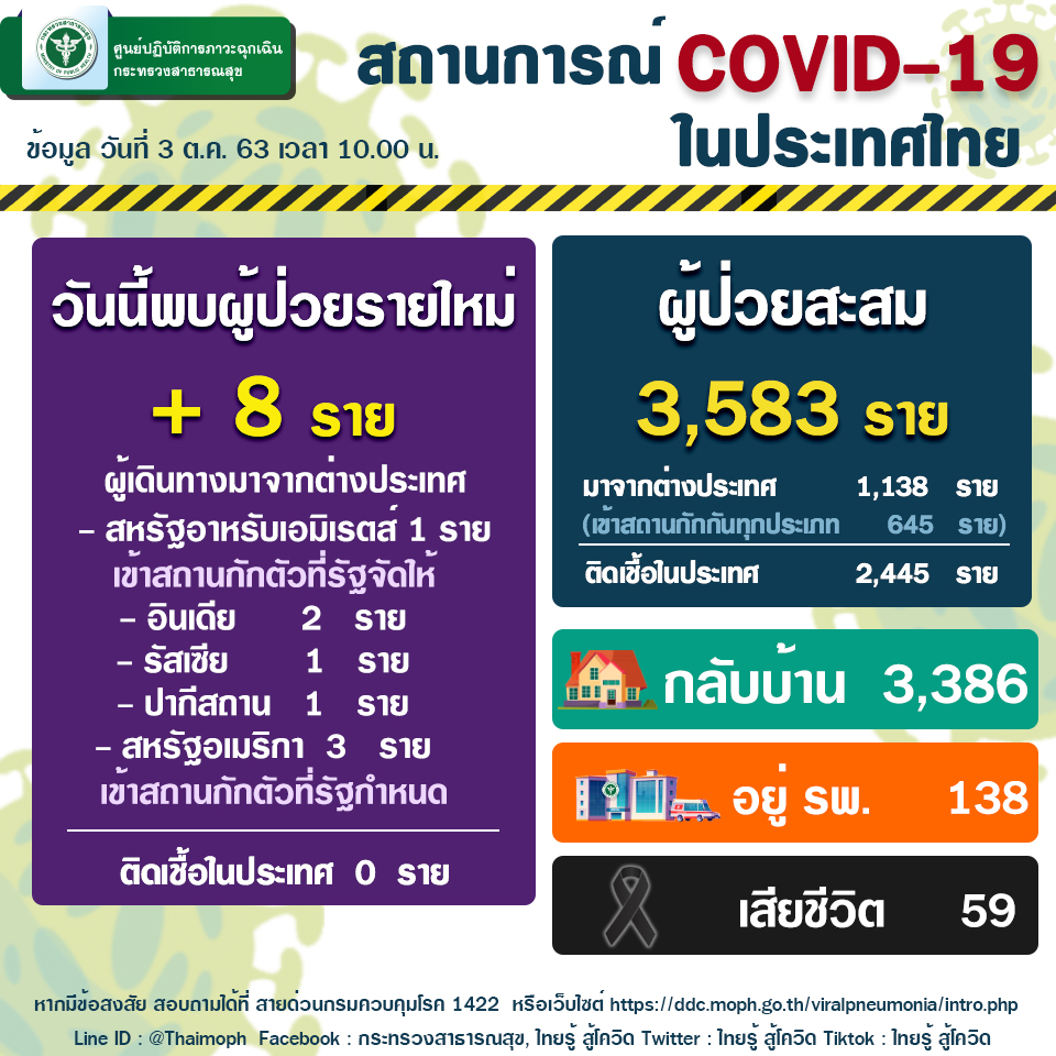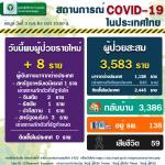 สถานการณ์ผู้ติดเชื้อไวรัสโคโรนา 2019 ในประเทศไทยวันนี้ มีผู้ติดเชื้อรายใหม่ 8 ราย เป็นผู้เดินทางจากต่างประเทศ (อินเดีย 2 ราย, สหรัฐอาหรับเอมิเรตส์ 1 ราย, รัสเซีย 1 ราย, สหรัฐอเมริกา 3 ราย, ปากีสถาน 1 ราย) ทุกรายเข้ากักตัวในสถานที่รัฐจัดให้, สถานกักตัวที่รัฐกำหนด มีผู้ป่วยกลับบ้านได้ 2 ราย ทำให้ผู้ป่วยกลับบ้านสะสม 3,386 ราย หรือคิดเป็นร้อยละ 94.50 ของผู้ป่วยทั้งหมด มีผู้ป่วยที่ยังรักษาอยู่ในโรงพยาบาล 138 รายหรือร้อยละ 3.85 ของผู้ป่วยทั้งหมด ไม่มีผู้เสียชีวิตเพิ่ม รวมผู้เสียชีวิตสะสม 59 ราย ผู้ป่วยสะสมทั้งสิ้น 3,583 ราย