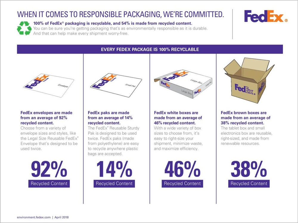 การรีไซเคิลและลดเปเปอร์ฟุตพริ้นท์ (paper footprint) บรรจุภัณฑ์ทุกชิ้นของเฟดเอ็กซ์สามารถรีไซเคิลได้ 100% และทำมาจากวัสดุรีไซเคิลถึง 54% ซึ่งกระดาษของเรานั้นเป็นมิตรต่อป่าไม้ ได้รับการรับรองแล้วว่าใช้วัสดุจากป่าไม้ยั่งยืนในองค์การจัดการด้านป่าไม้ Forest Stewardship Council™ (FSC™) และเรายังเริ่มลงทุนด้านการใช้กระดาษที่ทำมาจากวัสดุทดแทนไฟเบอร์ เพื่อลดการทำลายป่าไม้อีกด้วย