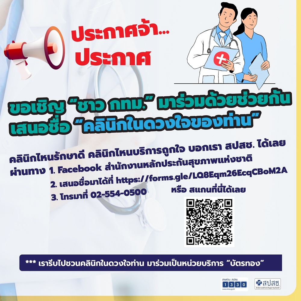 "ท่านอาจจะได้ไปรับบริการในคลินิกหรือโรงพยาบาลเอกชนแล้วรู้สึกว่าได้รับการให้บริการที่ดี แพทย์พยาบาลให้การดูแลดี หรือจะด้วยเหตุผลอื่นๆ ที่ทำให้เกิดความประทับใจในการให้บริการ เราเปิดให้ประชาชนสามารถเสนอรายชื่อหน่วยบริการเหล่านี้เข้ามาได้ทาง Facebook สปสช. (https://web.facebook.com/NHSO.Thailand) หรือที่ https://forms.gle/o1M7N62h41v5Ae4n9 หรือโทรศัพท์แจ้งมาได้ที่ 02-554-0500 เพื่อที่ทาง สปสช.จะได้เข้าไปเจรจาเชิญชวนให้หน่วยบริการเหล่านี้มาเข้าร่วมให้บริการแก่ประชาชนต่อไป" นพ.ศักดิ์ชัย กล่าว