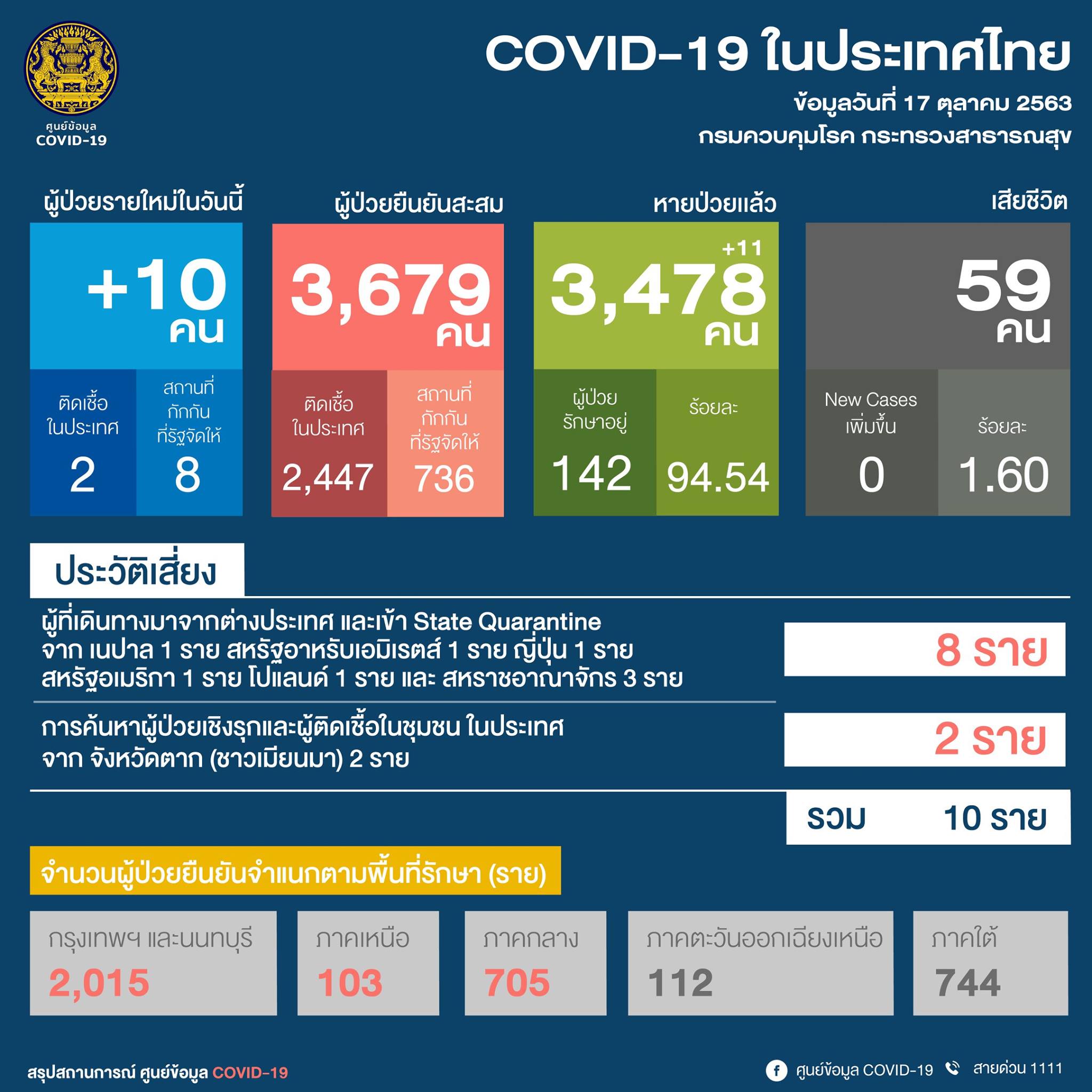 วันที่ 17 ตุลาคม 2563 ศูนย์บริหารสถานการณ์การแพร่ระบาดของโรคติดเชื้อไวรัสโคโรนา 2019 (COVID-19) หรือ ศบค. เผยแพร่ข้อมูลสถานการณ์การติดเชื้อโควิด-19 ประจำวันว่า มีผู้ป่วยรายใหม่เพิ่มขึ้นอีก 10 ราย โดยเดินทางมาจากเนปาล 1 ราย สหรัฐอาหรับเอมิเรตส์ 1 ราย ญี่ปุ่น 1 ราย สหรัฐอเมริกา 1 ราย โปแลนด์ 1 ราย และสหราชอาณาจักร 3 ราย ทั้งหมดเข้าสถานกักกันของรัฐ หรือ State Quarantine