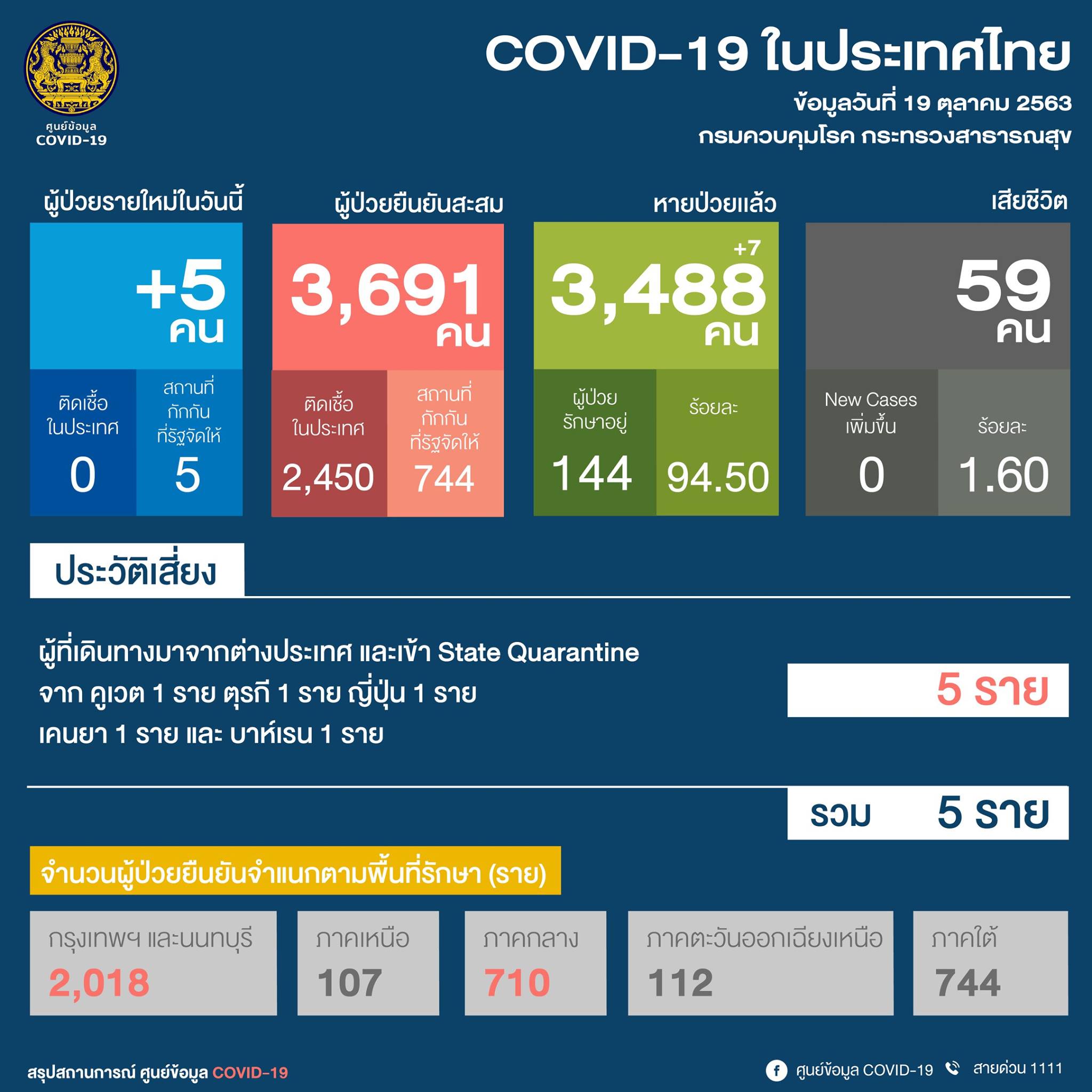 รายงานจากศูนย์บริหารสถานการณ์โควิด-19 (ศบค.) เปิดเผยว่า สถานการณ์การติดเชื้อโควิด-19 ในวันนี้ (19 ต.ค.63) พบผู้ป่วยรายใหม่ 5 คน กลับจากต่างประเทศ ทำให้ผู้ป่วยยืนยันสะสมอยู่ที่ 3,691 คน เป็นผู้ติดเชื้อในประเทศ 2,450 คน และจากสถานกักกันที่รัฐจัดให้ 744 คน มีผู้ป่วยรักษาหายเพิ่ม 7 คน รวมหายป่วยสะสม 3,488 คน อยู่ระหว่างการรักษา 144 คน และเสียชีวิต 59 คน