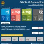 รายงานจากศูนย์บริหารสถานการณ์โควิด-19 (ศบค.) เปิดเผยว่า สถานการณ์การติดเชื้อโควิด-19 ในวันนี้ (21 ต.ค.63) พบผู้ป่วยรายใหม่ 9 คน กลับจากต่างประเทศ ทำให้ผู้ป่วยยืนยันสะสมอยู่ที่ 3,709 คน เป็นผู้ติดเชื้อในประเทศ 2,450 คน และจากสถานกักกันที่รัฐจัดให้ 762 คน มีผู้ป่วยรักษาหายเพิ่ม 4 คน รวมหายป่วยสะสม 3,495 คน อยู่ระหว่างการรักษา 155 คน และเสียชีวิต 59 คน