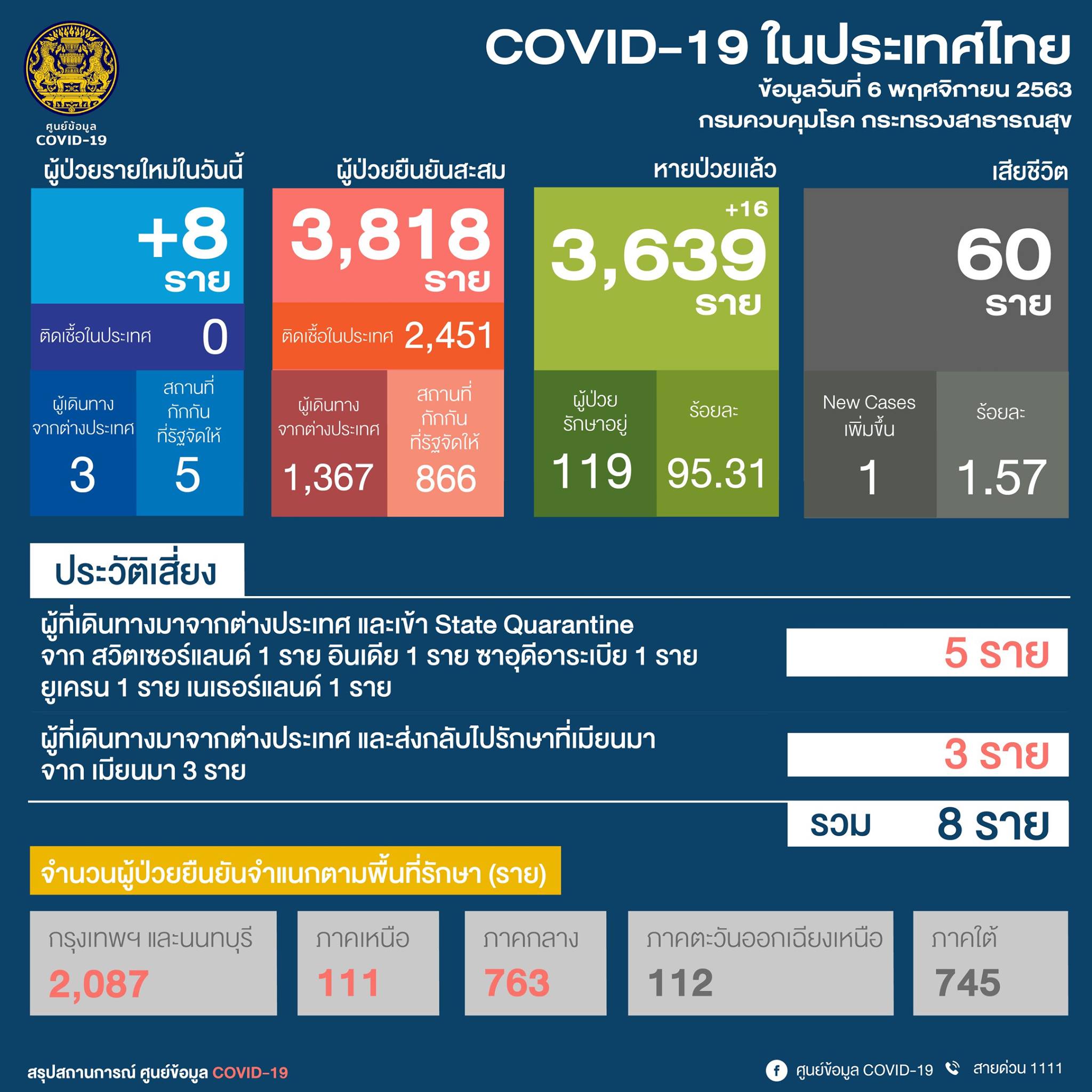 รายงานจากศูนย์บริหารสถานการณ์โควิด-19 (ศบค.) เปิดเผยว่า สถานการณ์การติดเชื้อโควิด-19 ในวันนี้ (6 พ.ย.63) พบผู้ป่วยรายใหม่ 8 คน ทั้งหมดกลับจากต่างประเทศ ทำให้ผู้ป่วยยืนยันสะสมอยู่ที่ 3,818 คน เป็นผู้ติดเชื้อในประเทศ 2,451 คน และจากสถานกักกันที่รัฐจัดให้ 866 คน มีผู้ป่วยรักษาหายเพิ่ม 16 คน รวมหายป่วยสะสม 3,639 คน อยู่ระหว่างการรักษา 119 คน และเสียชีวิตเพิ่ม 1 คน รวมเสียชีวิต 59 คน