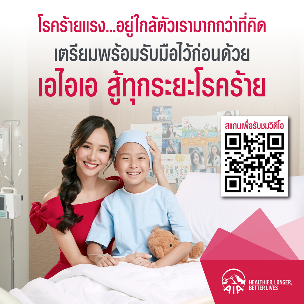 สามารถติดตามภาพยนตร์โฆษณาออนไลน์ชุด ‘เอไอเอ สู้ทุกระยะโรคร้าย’ ได้ทาง AIA Official Facebook Page และทาง AIA Thailand YouTube Channel รวมถึงสื่อออนไลน์อื่น ๆ ตั้งแต่วันนี้เป็นต้นไป หรือสแกน QR Code เพื่อรับชมภาพยนตร์โฆษณา
