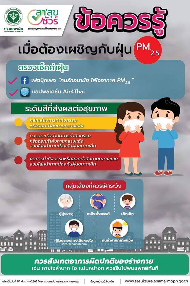 ทั้งนี้ ประชาชนควรหมั่นสังเกตอาการที่อาจเกิดขึ้น หากมีโรคประจำตัวต้องระมัดระวังเป็นพิเศษควรพักผ่อนให้เพียงพอ ลดการทำกิจกรรมและออกกำลังกายกลางแจ้ง โดยเฉพาะกลุ่มเสี่ยง ได้แก่ เด็ก ผู้สูงอายุ และผู้ที่มีโรคประจำตัว หากมีอาการผิดปกติ เช่น ไอบ่อย หายใจลำบาก หายใจถี่ หรือวิงเวียนศีรษะ ให้รีบไปพบแพทย์ และสอบถามข้อมูลเพิ่มเติมได้ที่สายด่วนกรมควบคุมโรค 1422