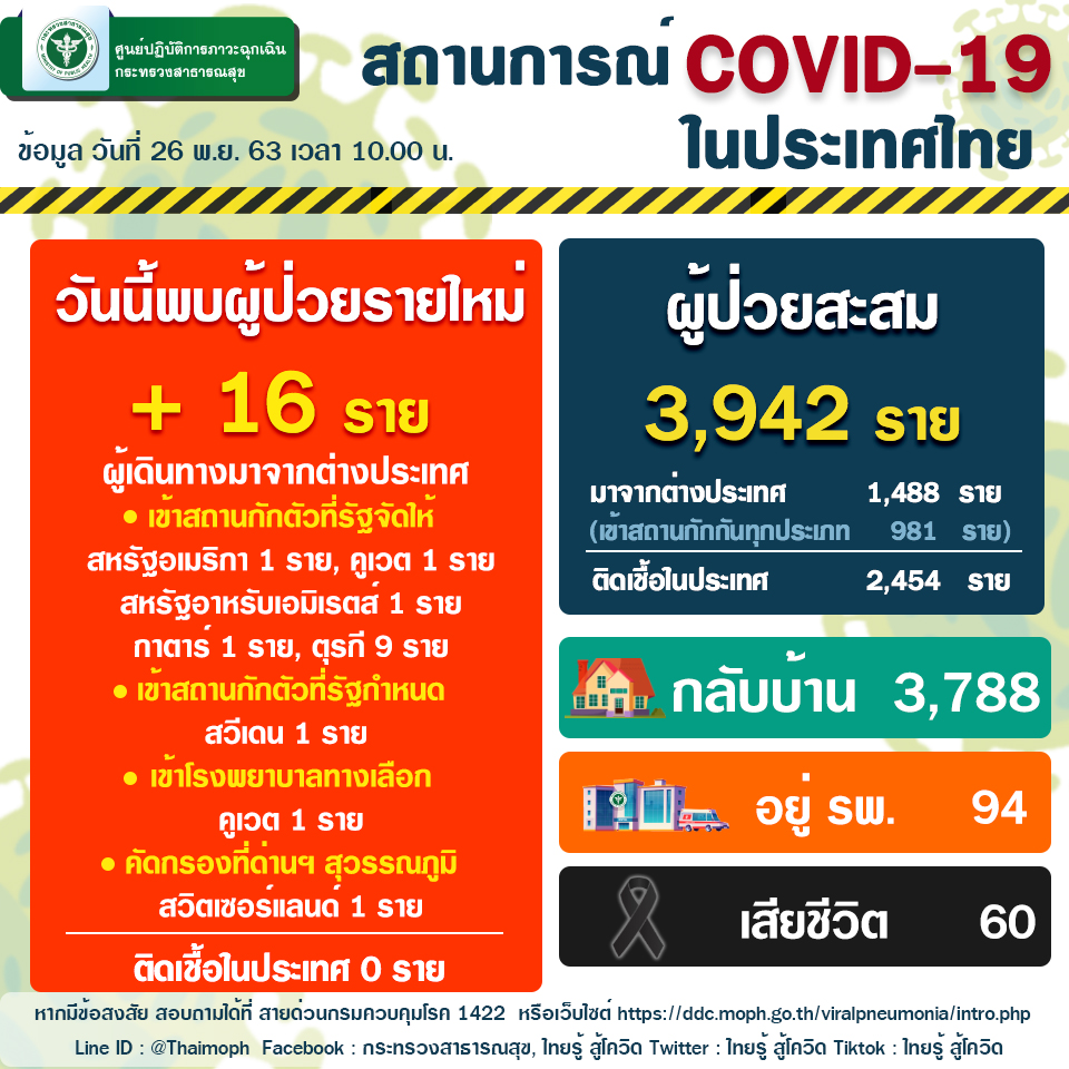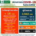 สถานการณ์ผู้ติดเชื้อไวรัสโคโรนา 2019 ในประเทศไทยวันนี้ มีผู้ติดเชื้อรายใหม่ 16 ราย ทุกรายเป็นผู้เดินทางจากต่างประเทศ ตรวจพบที่ด่านควบคุมโรคเข้าเกณฑ์เฝ้าระวังอาการ 1 ราย เข้ากักตัวในสถานที่รัฐจัดให้ 13 ราย เข้ากักตัวในสถานที่รัฐกำหนด 1 ราย และโรงพยาบาลทางเลือก 1 ราย มีผู้ป่วยกลับบ้านได้ 8 ราย ทำให้ผู้ป่วยกลับบ้านสะสม 3,788 ราย หรือคิดเป็นร้อยละ 96.09 ของผู้ป่วยทั้งหมด มีผู้ป่วยยังรักษาอยู่ในโรงพยาบาล 94 ราย หรือคิดเป็นร้อยละ 2.38 ของผู้ป่วยทั้งหมด ไม่มีผู้เสียชีวิตเพิ่ม รวมผู้เสียชีวิตสะสม 60 ราย ผู้ป่วยสะสมทั้งสิ้น 3,942 ราย