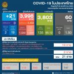 สำหรับผู้ป่วยใหม่ 21 คน เป็นผู้เดินทางมาจากต่างประเทศ และเข้าพัก State Quarantine โดยมาจากอินเดีย 1 คน อิตาลี 1 คน เยอรมนี 2 คน สวิตเซอร์แลนด์ 3 คน ญี่ปุ่น 4 คน ฝรั่งเศส 1 คน สหราชอาณาจักร 1 คน รัสเซีย 2 คน เดนมาร์ก 1 คน โอมาน 1 คน เนเธอร์แลนด์ 1 คน และสหรัฐอเมริกา 1 คน