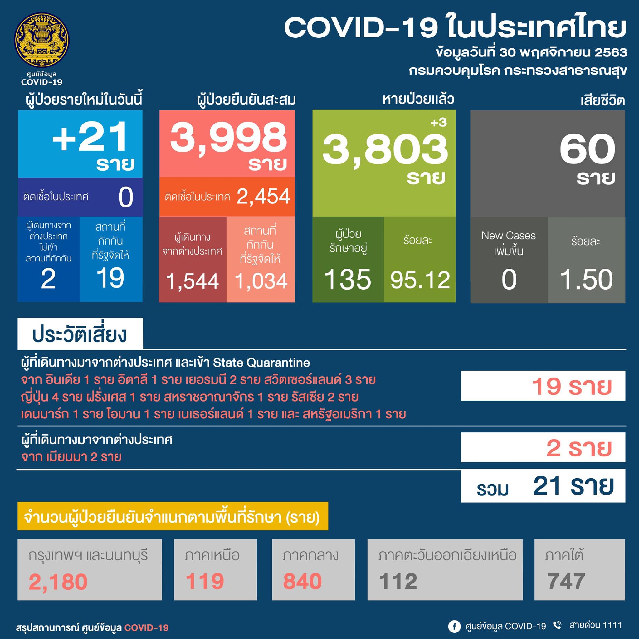รายงานจากศูนย์บริหารสถานการณ์โควิด-19 (ศบค.) เปิดเผยว่า สถานการณ์การติดเชื้อโควิด-19 ในวันนี้ (30 พ.ย.63) พบผู้ป่วยรายใหม่ 21 คน โดยเป็นคนไทย 17 คน และชาวอินเดีย 2 คน เดินทางกลับจากต่างประเทศ ทำให้ผู้ป่วยยืนยันสะสมอยู่ที่ 3,998 คน เป็นผู้ติดเชื้อในประเทศ 2,454 คน และ ผู้เดินทางจากต่างประเทศ 1,544 คน จากสถานกักกันที่รัฐจัดให้ 1,034 คน มีผู้ป่วยรักษาหายเพิ่ม 3 คน รวมหายป่วยสะสม 3,803 คน อยู่ระหว่างการรักษา 135 คน และเสียชีวิตรวม 60 คน