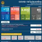 รายงานจากศูนย์บริหารสถานการณ์โควิด-19 (ศบค.) เปิดเผยว่า สถานการณ์การติดเชื้อโควิด-19 ในวันนี้ (3 ธ.ค.63) พบผู้ป่วยรายใหม่ 13 คน เดินทางกลับจากต่างประเทศ ทำให้ผู้ป่วยยืนยันสะสมอยู่ที่ 4,039 คน เป็นผู้ติดเชื้อในประเทศ 2,454 คน และ ผู้เดินทางจากต่างประเทศ 1,585 คน จากสถานกักกันที่รัฐจัดให้ 1,068 คน มีผู้ป่วยรักษาหายเพิ่ม 10 คน รวมหายป่วยสะสม 3,832 คน อยู่ระหว่างการรักษา 147 คน และเสียชีวิตรวม 60 คน