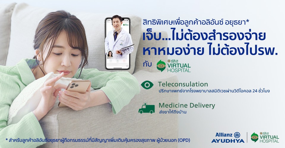 อลิอันซ์ อยุธยา มอบสิทธิพิเศษให้กับลูกค้าผที่มีสัญญาเพิ่มเติมคุ้มครองสุขภาพ ผู้ป่วยนอก(OPD) สามารถใช้บริการปรึกษา ผ่าน Telemedicine - SAMITIVEJ VIRTUAL HOSPITAL เพิ่มความสะดวกในการพบแพทย์ ให้บริการได้ครอบคลุมผ่านวิดีโอคอล ปรึกษาคุณหมอได้ทุกที่ทุกเวลาผ่านมือถือ เพื่อช่วยลดค่าใช้จ่ายในการเดินทางมาโรงพยาบาล นอกจากนี้ค่าใช้จ่ายในการพบแพทย์ หรือสั่งยาพร้อมจัดส่งให้ถึงบ้าน สามารถเบิกค่ารักษาพยาบาลผู้ป่วยนอกได้ตามจริง (ไม่เกินผลประโยชน์ที่ซื้อไว้) หรืออ่านรายละเอียดเพิ่มเติมได้ที่ https://bit.ly/33QMnLp หรือโทร. 1373