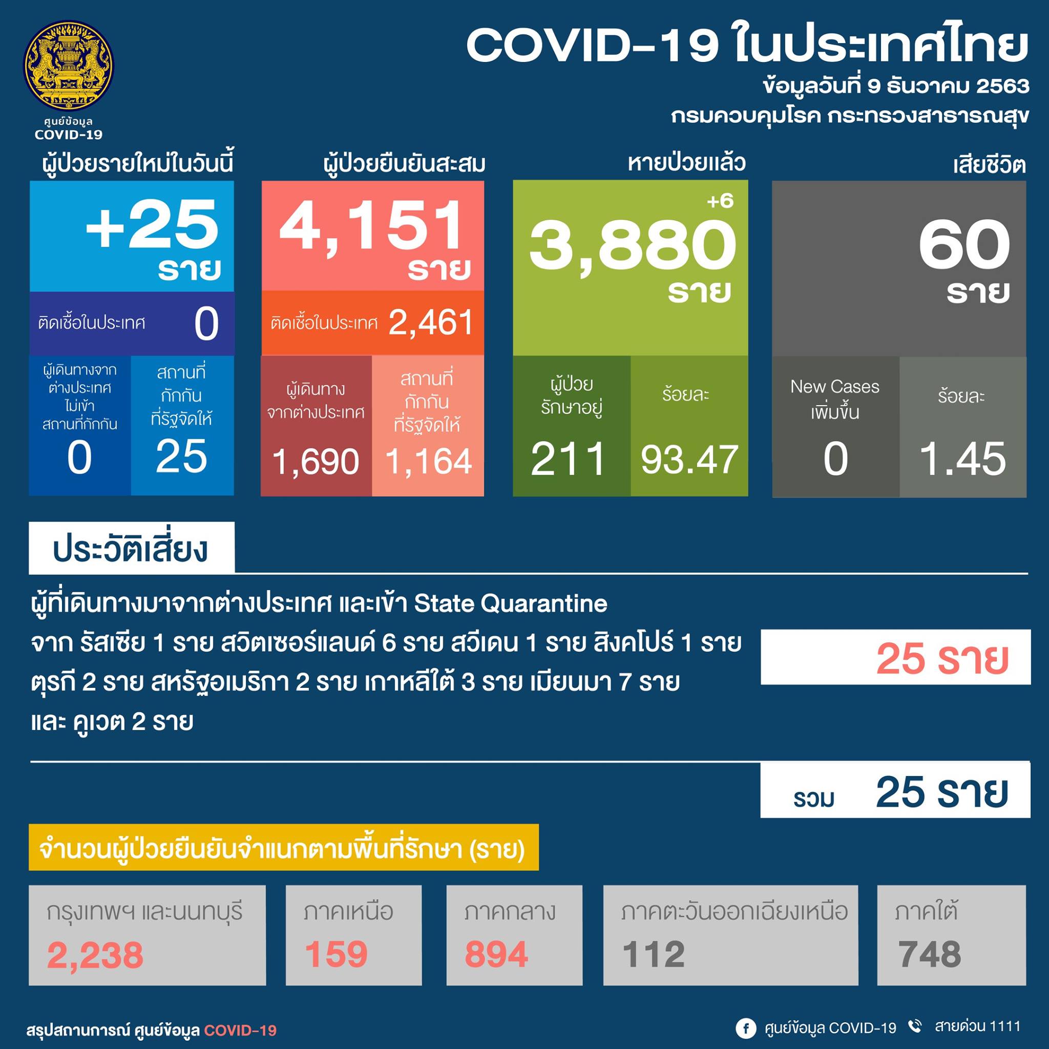 รายงานจากศูนย์บริหารสถานการณ์โควิด-19 (ศบค.) เปิดเผยว่า สถานการณ์การติดเชื้อโควิด-19 ในวันนี้ (9 ธ.ค.63) พบผู้ป่วยรายใหม่ 25 คน เดินทางกลับจากต่างประเทศ ทำให้ผู้ป่วยยืนยันสะสมอยู่ที่ 4,151 คน เป็นผู้ติดเชื้อในประเทศ 2,461 คน และ ผู้เดินทางจากต่างประเทศ 1,690 คน จากสถานกักกันที่รัฐจัดให้ 1,164 คน มีผู้ป่วยรักษาหายเพิ่ม 6 คน รวมหายป่วยสะสม 3,880 คน อยู่ระหว่างการรักษา 211 คน และเสียชีวิตรวม 60 คน