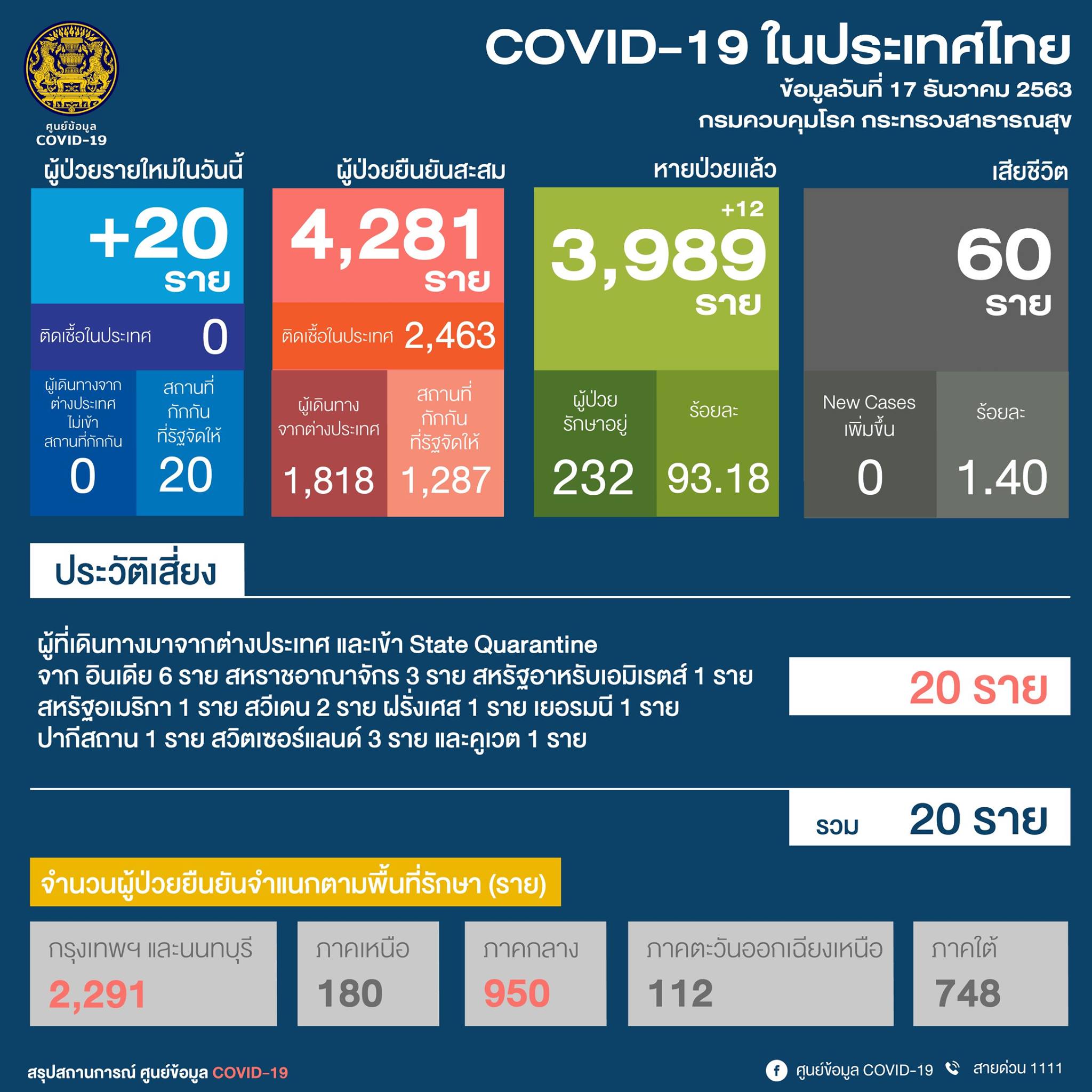 นายแพทย์ทวีศิลป์ วิษณุโยธิน โฆษกศูนย์บริหารสถานการณ์การแพร่ระบาดของโรคติดเชื้อไวรัสโคโรนา 2019 ? (ศบค.) เปิดเผยว่า สถานการณ์การติดเชื้อโควิด-19 ในวันนี้ (17 ธ.ค.63) พบผู้ป่วยรายใหม่ 20 คน เดินทางกลับจากต่างประเทศ ทำให้ผู้ป่วยยืนยันสะสมอยู่ที่ 4,281 คน เป็นผู้ติดเชื้อในประเทศ 2,463 คน และ ผู้เดินทางจากต่างประเทศ 1,818 คน จากสถานกักกันที่รัฐจัดให้ 1,287 คน มีผู้ป่วยรักษาหายเพิ่ม 12 คน รวมหายป่วยสะสม 3,989 คน อยู่ระหว่างการรักษา 232 คน และเสียชีวิตรวม 60 คน