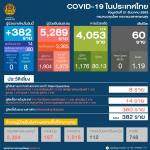 สำหรับผู้ป่วยใหม่ 382 คน แบ่ง 8 คน เป็นผู้เดินทางมาจากต่างประเทศ และเข้าพัก State Quarantine โดยมาจากสหราชอาณาจักร 1 คน สหรัฐอเมริกา 3 คน สหรัฐอาหรับเอมิเรตส์ 1 คน ยูเครน 1 คน คูเวต 1 คน และซูดาน 1 ราย เป็นการติดเชื้อในประเทศ 14 คน จาก จ.พระนครศรีอยุธยา 1 คน นครปฐม 2 คน สมุทรปราการ 3 คน สมุทรสาคร 5 คน กรุงเทพฯ 2 คน และตาก 1 คน เป็นหญิงสัญชาติเมียนมา เป็นพนักงานห้าง ทั้งหมดอยู่ในระหว่างการสอบสวนโรค และมีการเชื่อมโยงกับตลาดกุ้งใน จ.สมุทรสาคร