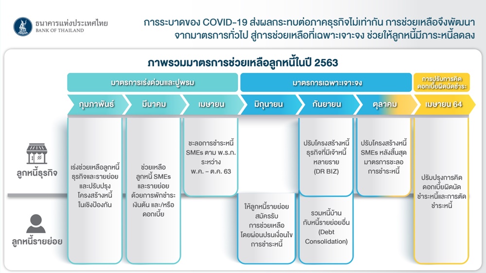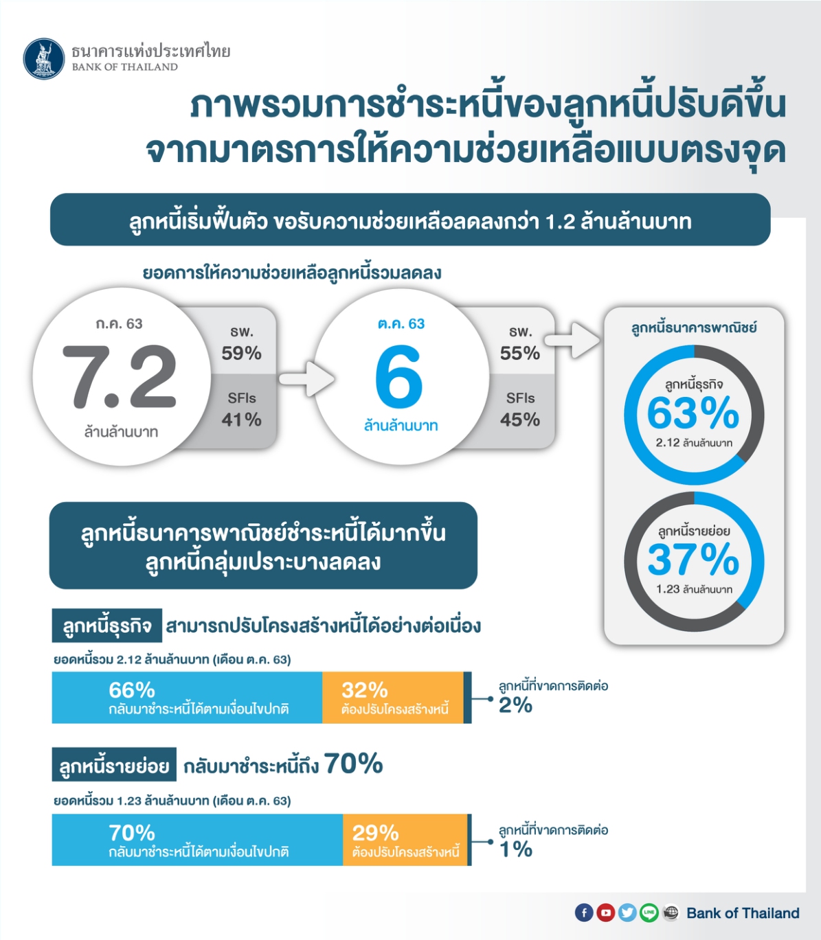 ในภาพรวมลูกหนี้ที่ขอรับการช่วยเหลือทยอยลดลงจาก 7.2 ล้านล้านบาท ในเดือนกรกฎาคม 2563 เหลือ 6 ล้านล้านบาท ในเดือนตุลาคม 2563 โดยเมื่อครบกำหนดมาตรการการพักชำระหนี้ ลูกหนี้ส่วนใหญ่ไม่ได้ขอรับความช่วยเหลือต่อ และสามารถกลับมาชำระหนี้ได้ตามปกติ ทั้งนี้ การช่วยเหลือที่ผ่านมาเป็นลูกหนี้ของธนาคารพาณิชย์ประมาณร้อยละ 55 และของสถาบันการเงินเฉพาะกิจร้อยละ 45