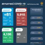 ทำให้มีผู้ป่วยยืนยันสะสมอยู่ที่ 5,910 คน เป็นผู้ติดเชื้อในประเทศ 3,967 คน ผู้เดินทางจากต่างประเทศ 1,943 คน ติดเชื้อในแรงงานต่างด้าว (จากการคัดกรองเชิงรุก) 1,308 คน มีผู้ป่วยรักษาหายเพิ่ม 21 คน รวมหายป่วยสะสม 4,130 คน อยู่ระหว่างการรักษา 1,713 คน และเสียชีวิตรวม 60 คน