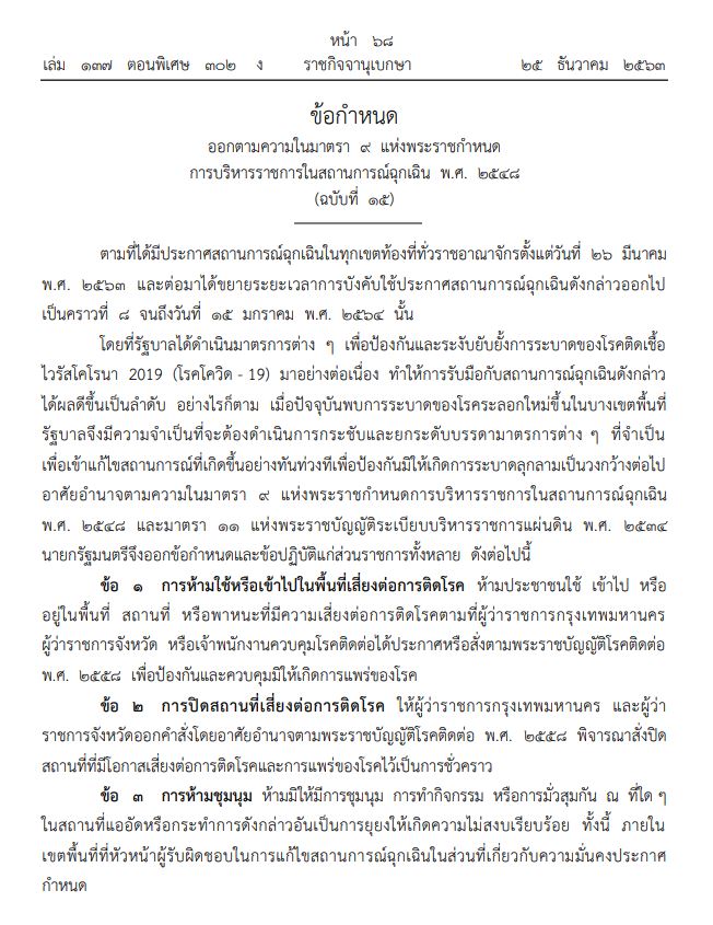 วันที่ 25 ธ.ค.2563 เว็บไซต์ราชกิจจานุเบกษา เผยแพร่ข้อกำหนด ออกตามความในมาตรา 9 แห่งพระราชกำหนดการบริหารราชการในสถานการณ์ฉุกเฉิน พ.ศ.2548 ฉบับที่ 15 โดยมีรายละเอียดดังนี้