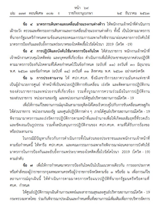 5. การปฏิบัติและบังคับใช้มาตรการป้องกันโรค ให้ส่วนราชการ พนักงานเจ้าหน้าที่ พนักงานควบคุมโรคติดต่อ และบุคคลที่เกี่ยวข้อง ดำเนินการให้ประชาชนทุกภาคส่วนปฏิบัติตามมาตรการป้องกันโรคอย่างเคร่งครัด