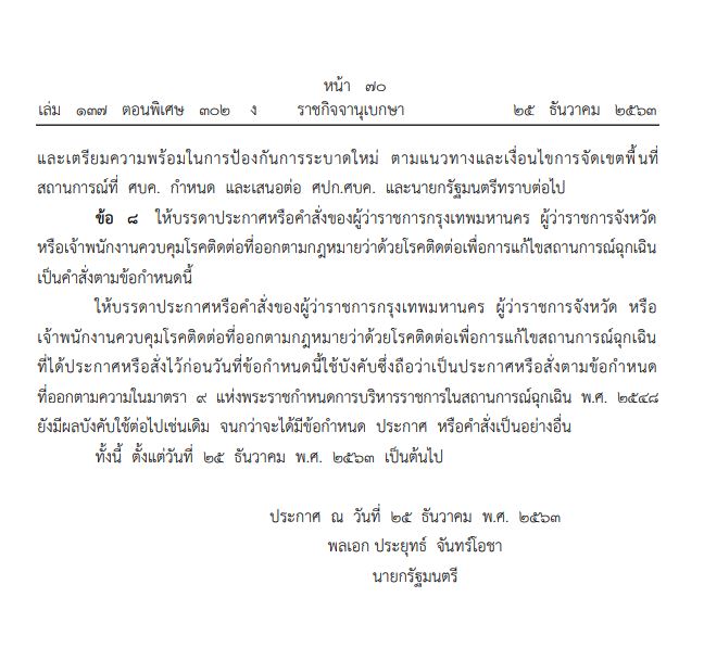 8. ให้บรรดาประกาศ หรือคำสั่งของผู้ว่าราชการกรุงเทพมหานคร ผู้ว่าราชการจังหวัด หรือเจ้าพนักงานควบคุมโรคติดต่อที่ออกตามกฎหมายว่าด้วยโรคติดต่อเพื่อแก้ไขสถานการณ์ฉุกเฉิน เป็นตามข้อกำหนดนี้