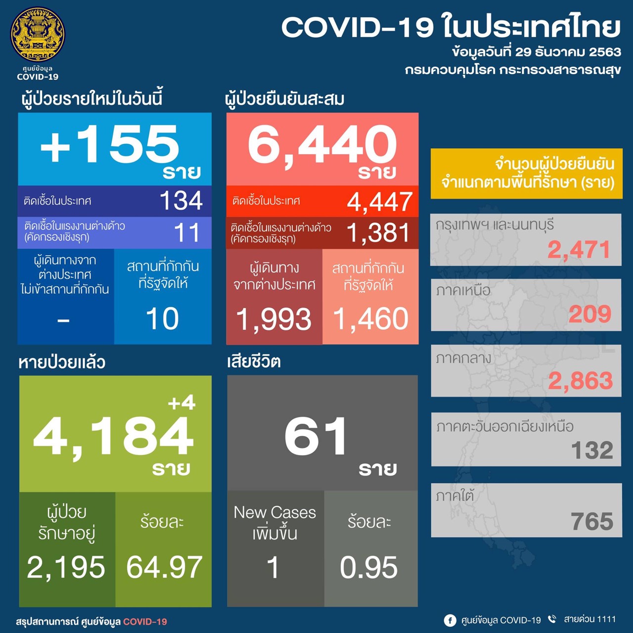นายแพทย์ทวีศิลป์ วิษณุโยธิน โฆษกศูนย์บริหารสถานการณ์การแพร่ระบาดของโรคติดเชื้อไวรัสโคโรนา 2019 ? (ศบค.) เปิดเผยว่า สถานการณ์การติดเชื้อโควิด-19 ในวันนี้ (29 ธ.ค.63) พบผู้ป่วยรายใหม่ 155 คน เป็นการติดเชื้อในประเทศ 134 คน ส่วนใหญ่ เชื่อมโยงตลาดกลางกุ้ง เป็นการติดเชื้อในแรงงานต่างด้าว (จากการคัดกรองเชิงรุก) 11 คน และผู้ที่เดินทางมาจากต่างประเทศและเข้าสถานกักกันที่รัฐจัดให้ (Quarantine Facilities) 10 คน จำนวนจังหวัดในไทยเพิ่มเป็น 45 จังหวัด