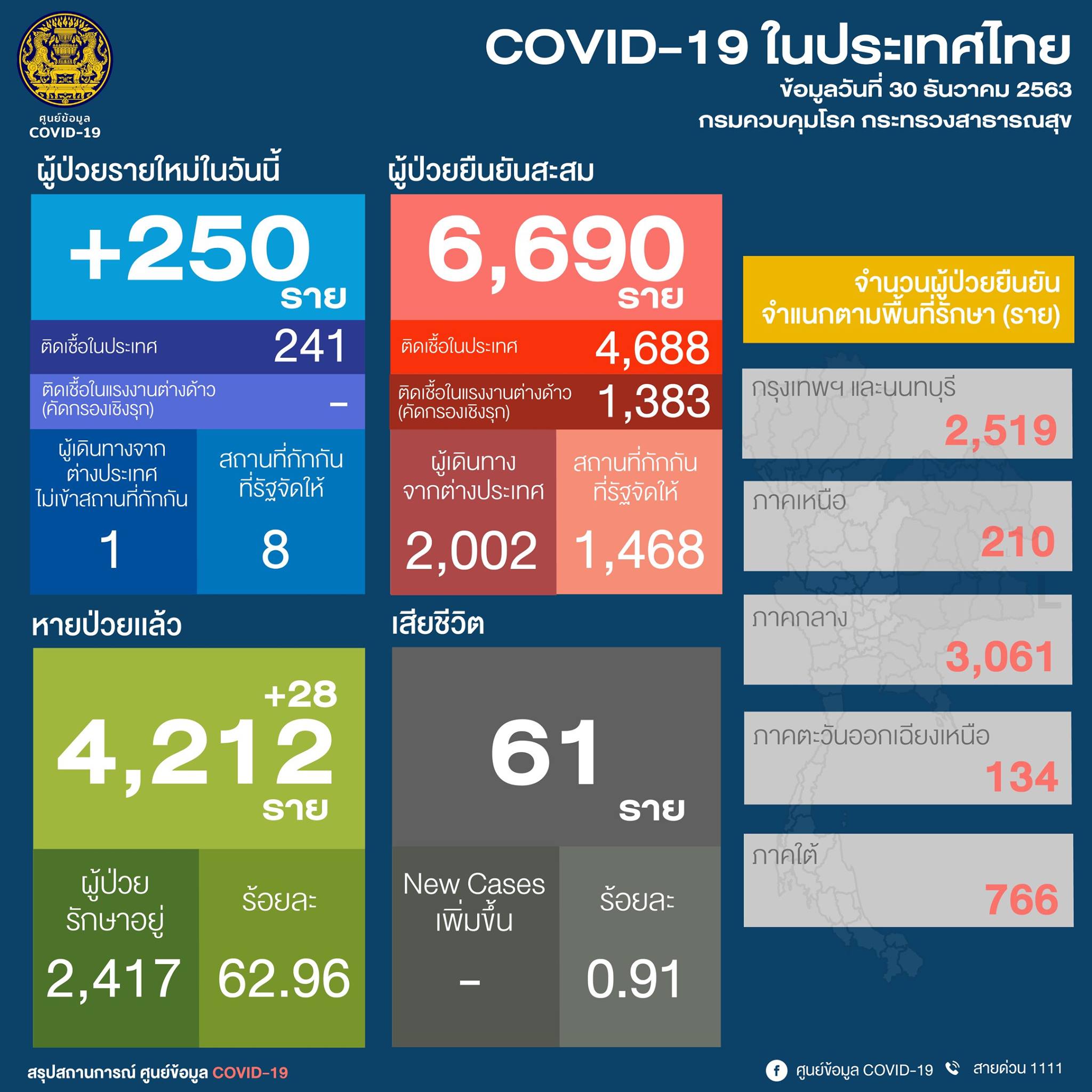 นายแพทย์ทวีศิลป์ วิษณุโยธิน โฆษกศูนย์บริหารสถานการณ์การแพร่ระบาดของโรคติดเชื้อไวรัสโคโรนา 2019 ? (ศบค.) เปิดเผยว่า สถานการณ์การติดเชื้อโควิด-19 ในวันนี้ (30 ธ.ค.63) พบผู้ป่วยรายใหม่ 250 คน เป็นการติดเชื้อในประเทศ 241 คน ส่วนใหญ่เชื่อมโยงตลาดกลางกุ้ง จ.สมุทรสาคร และเชื่อมโยงจ.ระยอง เป็นการติดเชื้อในแรงงานต่างด้าว (จากการคัดกรองเชิงรุก) 2 คน ถือว่าน้อยลงเรื่อยๆ