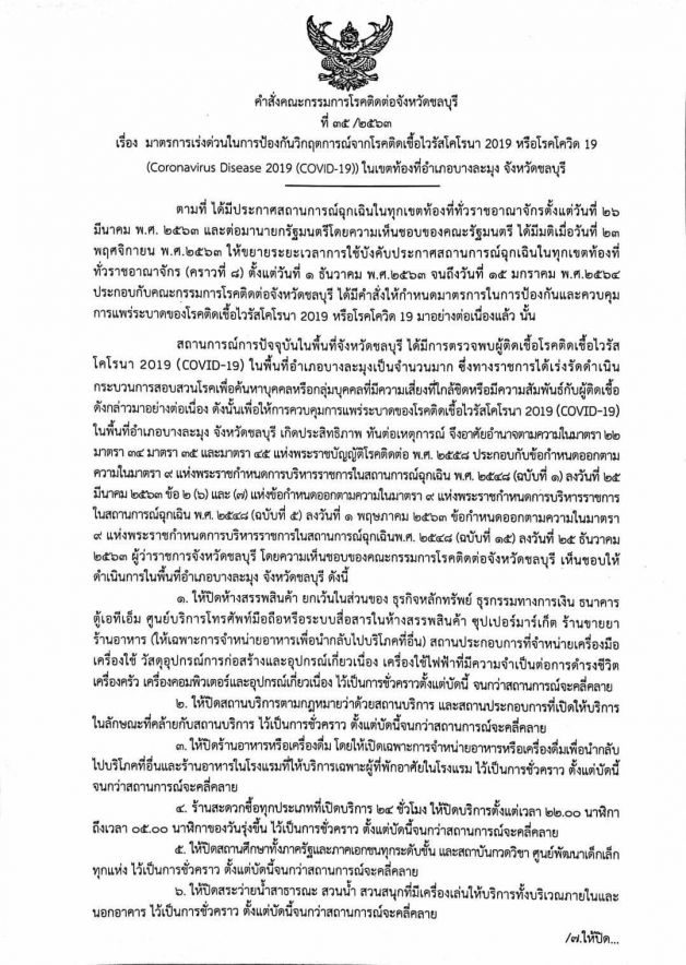 ผู้ว่าราชการ จ.ชลบุรี นายภัครธรณ์ เทียนชัย ออกคำสั่งวันนี้ (30 ธ.ค.) ให้ปิดสถานที่ต่างๆ อาทิ ศูนย์การค้า ผับ อาบอบนวด โรงเรียน เรื่อยไปจนถึงฟิตเนส และสถานที่อื่นๆ ที่มีคนรวมตัวจำนวนมาก ในพื้นที่ อ.บางละมุง ซึ่งเป็นที่ตั้งของเมืองพัทยา เพื่อควบคุมการแพร่รระบาดของโรคติดเชื้อไวรัสโคโรนา 2019 (โควิด-19) ซึ่งคำสั่งดังกล่าวเกิดขึ้นหลังจากเจ้าหน้าที่สาธารณสุขใน จ.ชลบุรี พบผู้ติดเชื้อรายใหม่ถึง 108 ราย ในวันนี้ (30 ธ.ค.) เพียงวันเดียว คาดประวัติโยงบ่อนพนัน