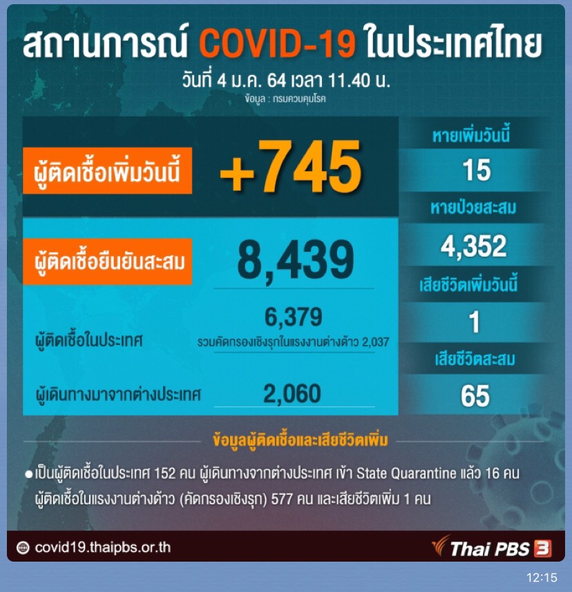 นายแพทย์ทวีศิลป์ วิษณุโยธิน โฆษกศูนย์บริหารสถานการณ์การแพร่ระบาดของโรคติดเชื้อไวรัสโคโรนา 2019 ? (ศบค.) เปิดเผยว่า สถานการณ์การติดเชื้อโควิด-19 ในวันนี้ (4 ม.ค.64 ) พบผู้ป่วยรายใหม่ 745 คน เป็นการติดเชื้อในประเทศ 152 คน ติดเชื้อในแรงงานต่างด้าว (จากการคัดกรองเชิงรุก) 577 คน และจากสถานที่กักกันที่รัฐจัดให้ 16 คน