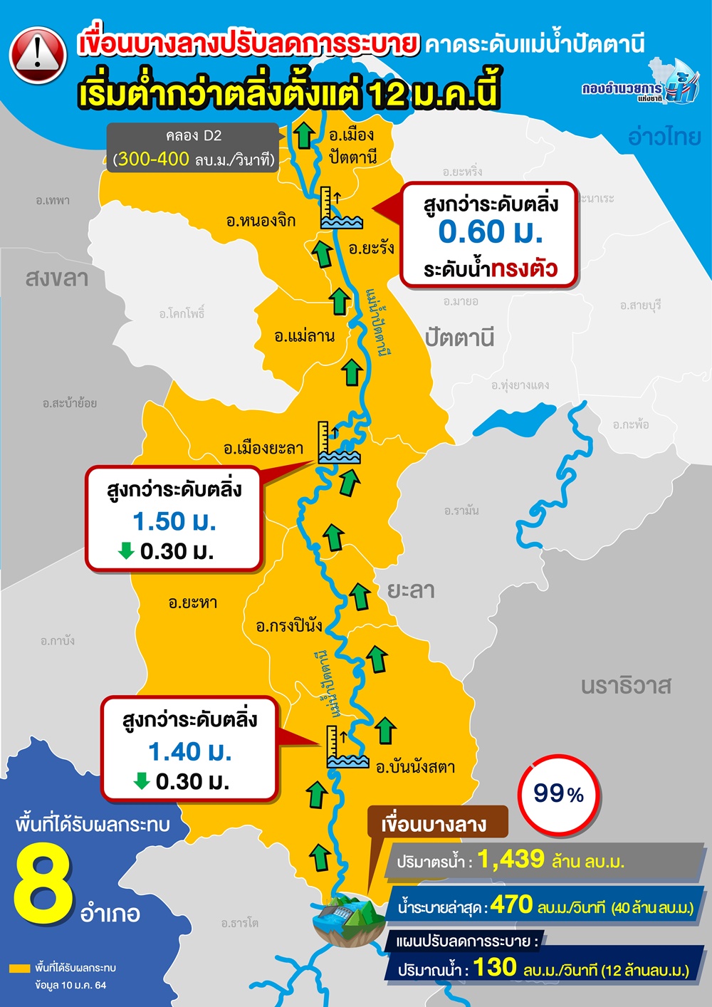 ดร.สมเกียรติ ประจำวงษ์ เลขาธิการสำนักงานทรัพยากรน้ำแห่งชาติ (สทนช.) ในฐานะรองผู้อำนวยการกองอำนวยการน้ำแห่งชาติ (กอนช.) เปิดเผยว่า สถานการณ์น้ำท่วมในพื้นที่ภาคใต้ตอนล่าง โดยเฉพาะที่จังหวัดยะลาและปัตตานี ล่าสุดวันนี้ (10 มกราคม 2564) กอนช. ประสานจังหวัดยะลา ปัตตานี กรมชลประทานและหน่วยงานที่เกี่ยวข้องเร่งดำเนินการบริหารจัดการน้ำโดยคำนึงถึงประชาชนในพื้นที่จังหวัดยะลา และปัตตานีที่จะได้รับผลกระทบเป็นสำคัญ โดยล่าสุดพบว่าขณะนี้ไม่มีฝนตกในพื้นที่แล้วแต่ยังคงได้รับอิทธิพลจากน้ำทะเลหนุนสูง ซึ่งเป็นอุปสรรคต่อการระบายน้ำออกสู่อ่าวไทย ปัจจุบันสถานการณ์น้ำที่เขื่อนบางลาง จังหวัดยะลา ณ วันที่ 10 มกราคม 2564 เวลา 06.00น. มีปริมาณน้ำ 1,439 ล้านลูกบาศก์เมตร คิดเป็นร้อยละ 99 ของระดับน้ำเก็บกัก อยู่ที่ระดับ 114.72 เมตรของระดับน้ำทะเลปานกลาง มีน้ำไหลลงเขื่อน 177 ลูกบาศก์เมตรต่อวินาที มีแนวโน้มลดลงอย่างต่อเนื่อง และระบายน้ำลงสู่แม่น้ำปัตตานีในลักษณะขั้นบันไดจากเดิมที่ระบายสูงสุดในวันที่ 6 มกราคม 2564 ปัจจุบันระบายในอัตรา 470 ลูกบาศก์เมตรต่อวินาที และจะปรับลดการระบายลงเรื่อย ๆ จนคงเหลือเพียงการระบายผ่านเครื่องกำเนิดไฟฟ้าตามแผนเดิมในอัตรา 130 ลูกบาศก์เมตรต่อวินาทีหรือคิดเป็นปริมาณน้ำวันละ 12 ล้านลูกบาศก์เมตร