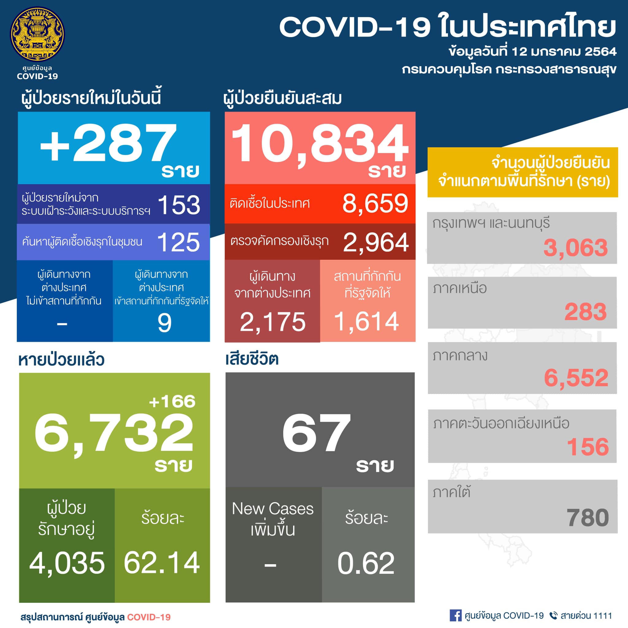 นายแพทย์ทวีศิลป์ วิษณุโยธิน โฆษกศูนย์บริหารสถานการณ์การแพร่ระบาดของโรคติดเชื้อไวรัสโคโรนา 2019 ? (ศบค.) เปิดเผยว่า สถานการณ์การติดเชื้อโควิด-19 ในวันนี้ (12 ม.ค.64 ) พบผู้ป่วยรายใหม่ 287 คน เป็นการติดเชื้อในประเทศ 278 คน ซึ่งมาจากระบบเฝ้าระวังและระบบบริการ 153 คน และการค้นหาเชิงรุกในชุมชน 125 คน และผู้เดินทางจากต่างประเทศและเข้าสถานที่กักกันที่รัฐจัดให้ 9 คน ไม่มีเสียชีวิตเพิ่ม