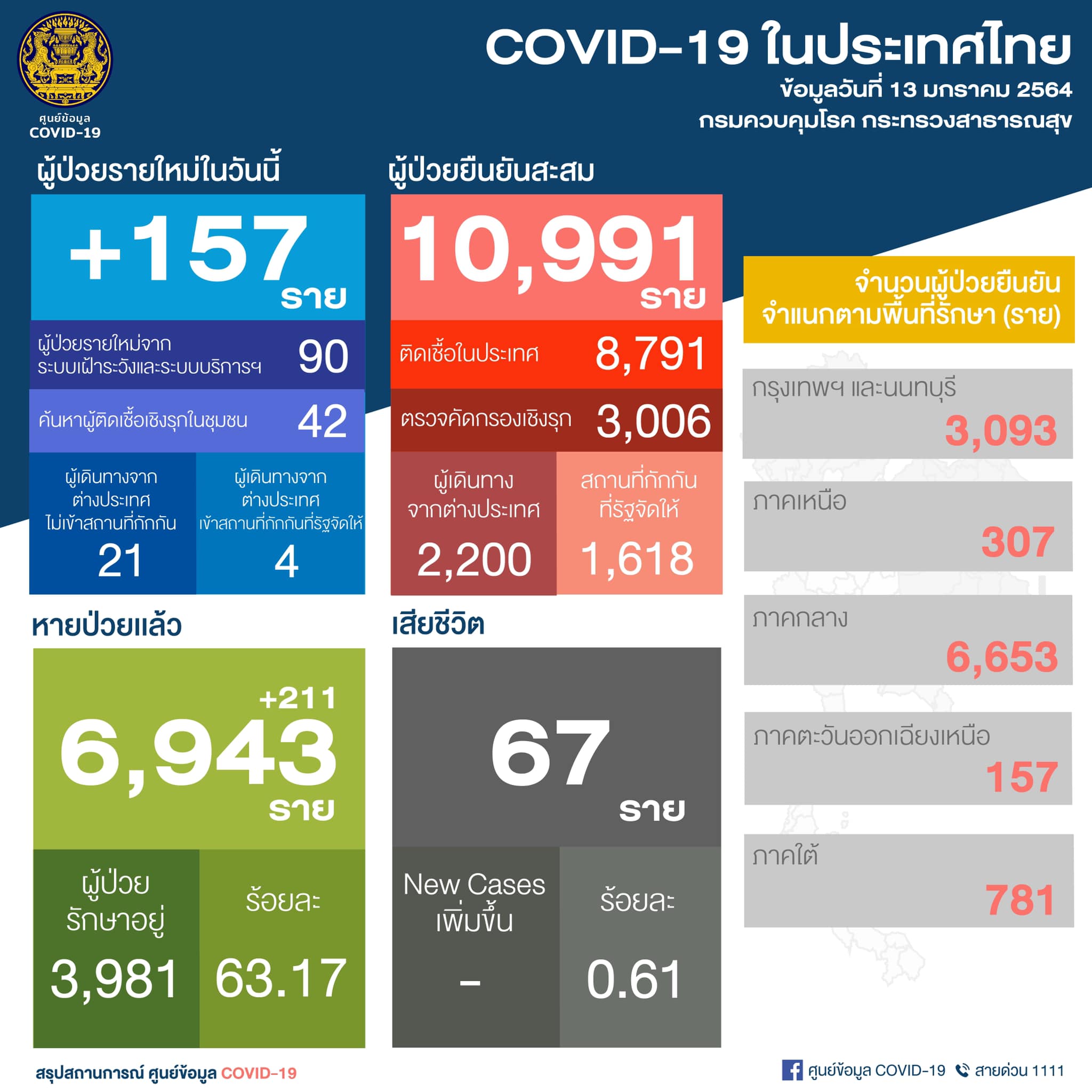 นายแพทย์ทวีศิลป์ วิษณุโยธิน โฆษกศูนย์บริหารสถานการณ์การแพร่ระบาดของโรคติดเชื้อไวรัสโคโรนา 2019 ? (ศบค.) เปิดเผยว่า สถานการณ์การติดเชื้อโควิด-19 ในวันนี้ (13 ม.ค.64 ) พบผู้ป่วยรายใหม่ 157 คน เป็นการติดเชื้อในประเทศ 132 คน ซึ่งมาจากระบบเฝ้าระวังและระบบบริการ 90 คน และการค้นหาเชิงรุกในชุมชน 42 คน ผู้เดินทางจากต่างประเทศไม่เข้าสถานกักกันของรัฐ 21 คน และผู้เดินทางจากต่างประเทศและเข้าสถานที่กักกันที่รัฐจัดให้ 4 คน ไม่มีเสียชีวิตเพิ่ม