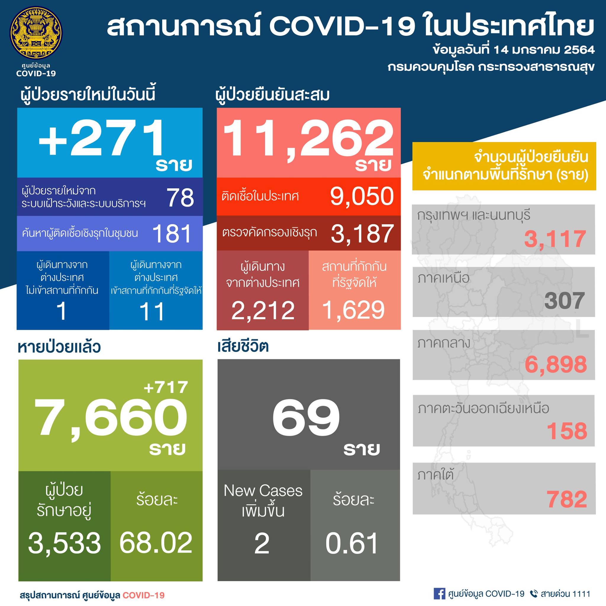 นายแพทย์ทวีศิลป์ วิษณุโยธิน โฆษกศูนย์บริหารสถานการณ์การแพร่ระบาดของโรคติดเชื้อไวรัสโคโรนา 2019 ? (ศบค.) เปิดเผยว่า สถานการณ์การติดเชื้อโควิด-19 ในวันนี้ (14 ม.ค.64 ) พบผู้ป่วยรายใหม่ 271 คน เป็นการติดเชื้อในประเทศ 259 คน ซึ่งมาจากระบบเฝ้าระวังและระบบบริการ 78 คน และการค้นหาเชิงรุกในชุมชน 181 คน ผู้เดินทางจากต่างประเทศไม่เข้าสถานกักกันของรัฐ 1 คน และผู้เดินทางจากต่างประเทศและเข้าสถานที่กักกันที่รัฐจัดให้ 11 คน เสียชีวิตเพิ่ม 2 คน