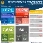 ศบค.พบผู้ติดเชื้อโควิดรายใหม่ 271 คน เป็นการติดเชื้อในประเทศ 259 คน จากการคัดกรองเชิงรุกและระบบเฝ้าระวัง ซึ่งส่วนใหญ่พบในจังหวัดสมุทรสาคร ส่งผลผู้ติดเชื้อสะสม 11,262 คน และมีผู้เสียชีวิตเพิ่ม 2 คน