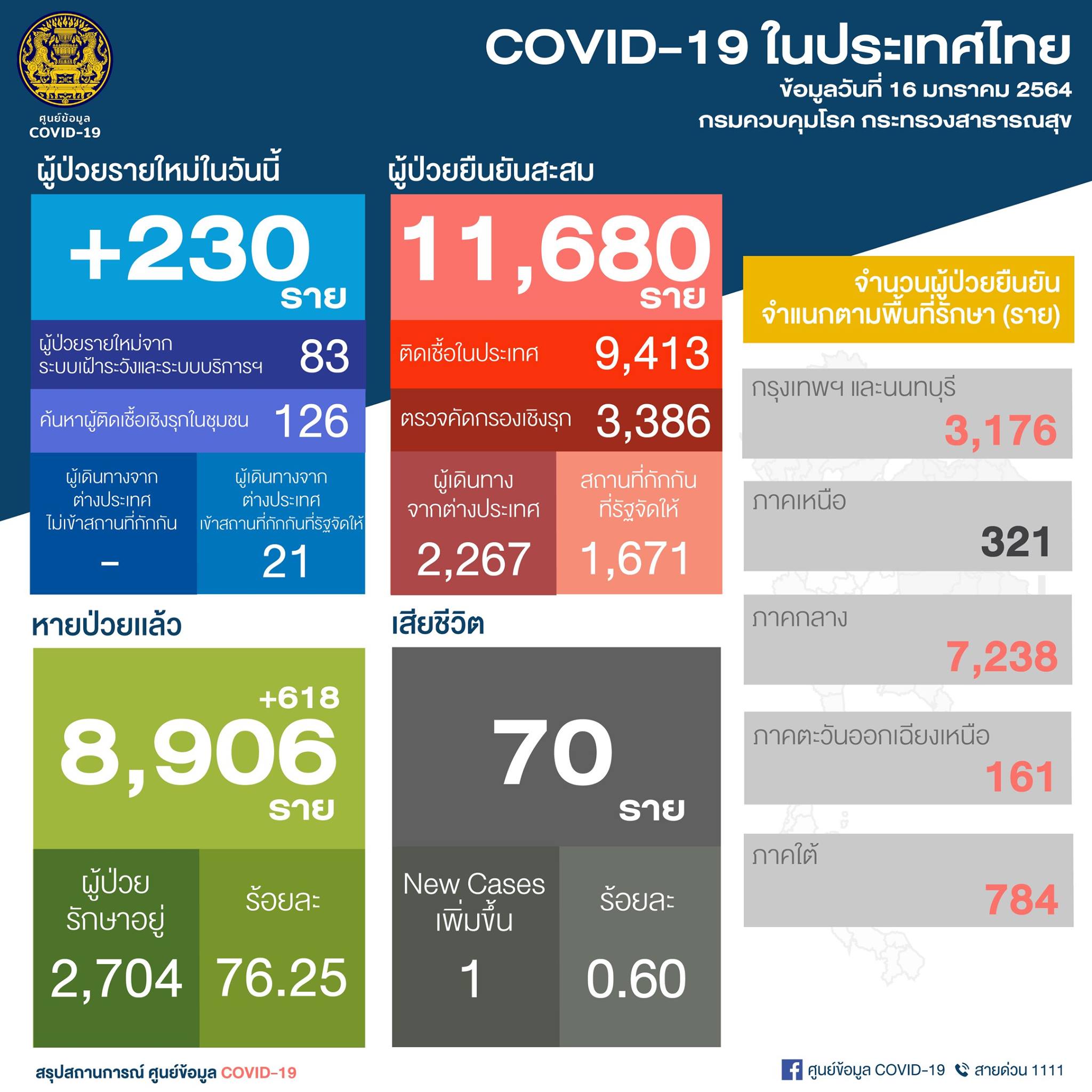 วันที่ 16 มกราคม 2564 ศบค.รายงานสถานการณ์การแพร่ระบาดของเชื้อโควิด-19 ประจำวันนี้ พบว่า มีผู้ป่วยรายใหม่ 230 ราย