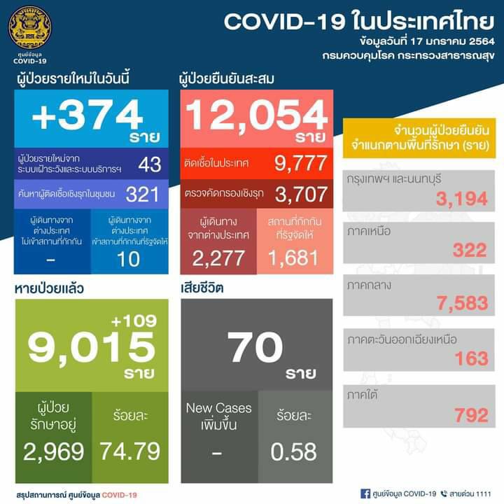 วันที่ 17 มกราคม 2564 นายแพทย์ทวีศิลป์ วิษณุโยธิน โฆษกศูนย์บริหารสถานการณ์การแพร่ระบาดของโรคติดเชื้อไวรัสโคโรนา 2019 (ศบค.) แถลงสถานการณ์ประจำวันว่า ผู้ป่วยรายใหม่เพิ่ม 374 ราย โดยเป็นผู้ป่วยรายใหม่จากระบบการเฝ้าระวัง 43 ราย และจากการค้นหาเชิงรุกในชุมชน 374 ราย และเป็นผู้เดินทางมาจากต่างประเทศและเข้าสถานที่กักกัน 10 ราย รวมผู้ป่วยยืนยันสะสม 12,054 ราย