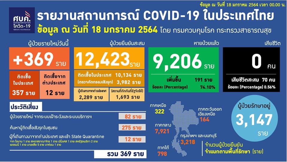 แพทย์หญิงอภิสมัย ศรีรังสรรค์ ผู้ช่วยโฆษก ศูนย์บริหารสถานการณ์การแพร่ระบาดของโรคติดเชื้อไวรัสโคโรนา 2019 ? (ศบค.) เปิดเผยว่า สถานการณ์การติดเชื้อโควิด-19 ในวันนี้ (18 ม.ค.64 ) พบผู้ป่วยรายใหม่ 369 คน เป็นการติดเชื้อในประเทศ 357 คน ซึ่งมาจากระบบเฝ้าระวังและระบบบริการ 82 คน และการค้นหาเชิงรุกในชุมชน 275 คน และผู้เดินทางจากต่างประเทศและเข้าสถานที่กักกันที่รัฐจัดให้ 12 คน