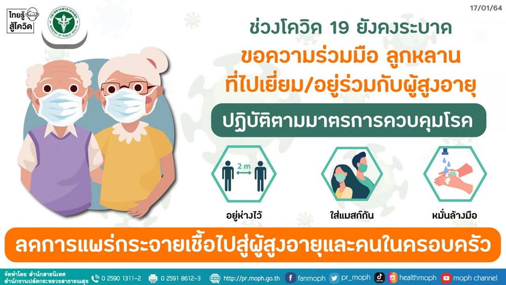 “การระบาดลอกใหม่ยังพบว่า ผู้เสียชีวิต 10 ราย ส่วนใหญ่เป็นผู้สูงอายุหรือมีโรคประจำตัว กลุ่มนี้เมื่อติดเชื้อมักจะเกิดภาวะแทรกซ้อนที่รุนแรง ขอความร่วมมือ ลูก หลานและคนในครอบครัว ระมัดระวัง เมื่อไปสถานที่เสี่ยง เช่น บ่อนการพนัน สถานบันเทิง หรือทำกิจกรรมที่เป็นความเสี่ยง ไม่ควรอยู่ใกล้ชิด แต่หากมีความจำเป็นต้องเข้มมาตรการ เว้นระยะห่าง ใส่หน้ากาก 100% ล้างมือบ่อยๆ จะเป็นการลดการแพร่กระจายไปยังผู้สูงอายุและคนในครอบครัวได้ ในส่วนสถานที่ดูแลกลุ่มเปราะบางหรือบ้านพักคนชรา ต้องมีมาตรการตรวจวัดอุณหภูมิทั้งผู้ที่เข้าเยี่ยมและเจ้าหน้าที่ดูแล ล้างมือบ่อยๆ และใส่หน้ากาก 100 % ซึ่งผ่านมาก็สามารถดำเนินการได้ดี”นพ.โอภาส กล่าว