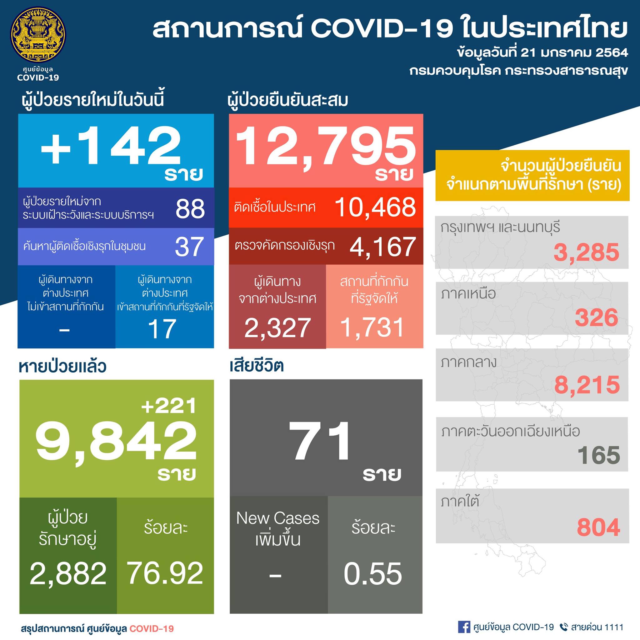 นายแพทย์ทวีศิลป์ วิษณุโยธิน โฆษกศูนย์บริหารสถานการณ์การแพร่ระบาดของโรคติดเชื้อไวรัสโคโรนา 2019 ? (ศบค.) เปิดเผยว่า สถานการณ์การติดเชื้อโควิด-19 ในวันนี้ (21 ม.ค.64 ) พบผู้ป่วยรายใหม่ 142 คน เป็นการติดเชื้อในประเทศ 125 คน ซึ่งมาจากระบบเฝ้าระวังและระบบบริการ 88 คน และการค้นหาเชิงรุกในชุมชน 37 คน และผู้เดินทางจากต่างประเทศและเข้าสถานที่กักกันที่รัฐจัดให้ 17 คน