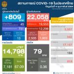 ส่งผลให้ผู้ป่วยยืนยันสะสม 22,058 คน เป็นการติดเชื้อในประเทศ 19,553 คน จากการคัดกรองเชิงรุก 12,298 คน จากผู้เดินทางจากต่างประเทศ 2,505 คน และสถานที่กักกันที่รัฐจัดให้ 1,903 คน มีผู้ป่วยหายเพิ่ม 797 คน รวมหายป่วยแล้ว 14,798 คน อยู่ระหว่างการรักษา 7,181 คน เสียชีวิตรวม 79 คน