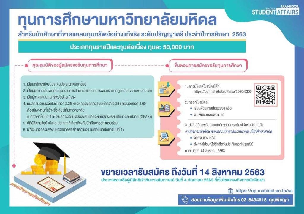 นอกจากทุนช่วยเหลือนักศึกษามหาวิทยาลัยมหิดลที่ได้รับผลกระทบจากวิกฤติ COVID-19 แล้ว มหาวิทยาลัยมหิดลยังได้จัดสรรทุนเพื่อช่วยแหลือนักศึกษามหาวิทยาลัยมหิดลที่ขาดแคลนทุนทรัพย์ ทั้งแบบให้ครั้งเดียว 50,000 บาท และแบบให้อย่างต่อเนื่องปีละ 50,000 บาทจนจบการศึกษา อีกเกือบ 300 ทุน โดยพิจารณาจากนักศึกษามหาวิทยาลัยมหิดลที่มีผลการเรียนสะสม หรือ GPA ไม่ต่ำกว่า 2.25 และคัดเลือกจากใบสมัครและการสัมภาษณ์