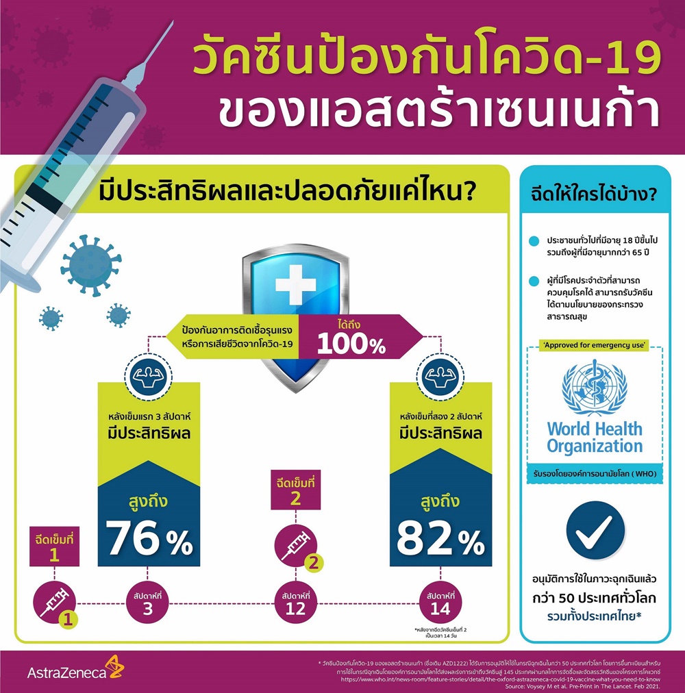 วัคซีนป้องกันโควิด-19 ของแอสตร้าเซนเนก้าได้รับการยืนยันว่ามีความปลอดภัยและสามารถป้องกันโควิด-19 ได้อย่างมีประสิทธิภาพเมื่อเว้นระยะเวลาในการให้วัคซีนโดสแรกและโดสที่สองห่างกันตั้งแต่ 4-12 สัปดาห์ ผลการทดลองทางคลินิกยังระบุว่าวัคซีนดังกล่าวสามารถป้องกันอาการติดเชื้ออย่างรุนแรงและการเสียชีวิตจากโควิด-19 ได้ 100% ตั้งแต่ 22 วันหลังจากฉีดวัคซีนโดสแรก