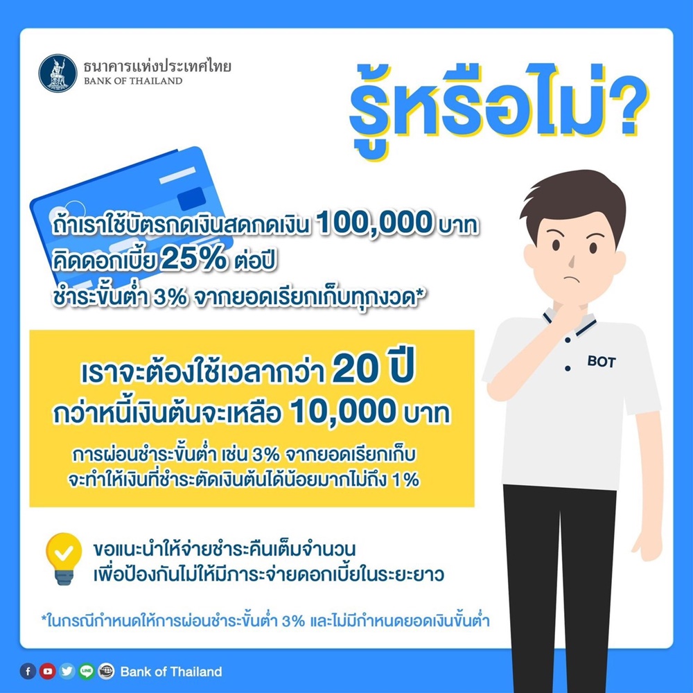 รู้หรือไม่! การเลือกจ่ายขั้นต่ำบัตรกดเงินสดที่มีดอกเบี้ยสูงงงง...อาจทำให้เราต้องแบกภาระหนี้ไปนานกว่า 20 ปี เพราะเงินส่วนใหญ่ที่เราจ่ายจะไปตัดแค่ดอกเบี้ย และตัดเงินต้นเป็นส่วนน้อย หากไม่อยากผ่อนหนี้นานแบบนี้ ทางที่ดีควรเลือกชำระเต็มจำนวน หรืออาจเปลี่ยนประเภทสินเชื่อเป็นการผ่อนชำระรายงวด เพื่อช่วยลดภาระดอกเบี้ย