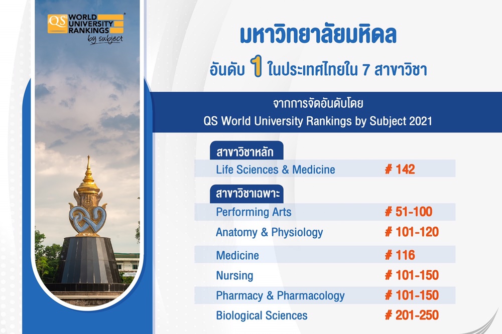 เมื่อเร็วๆ นี้ Quacquarelli Symonds (QS) ประกาศผลการจัดอันดับ QS World University Rankings by Subject 2021 ซึ่ง มหาวิทยาลัยมหิดล ได้รับการจัดอันดับจำนวน 17 สาขาวิชา จากทั้งหมด 51 สาขาวิชา โดยเป็นอันดับ 1 ในไทย ใน 7 สาขาวิชา (1 สาขาวิชาหลัก และ6 สาขาวิชาเฉพาะ) ได้แก่ Performing Arts อันดับที่ 51 - 100, Life Science & Medicine อันดับ 142, Anatomy & Physiology อันดับที่ 101 - 120, Biological Sciences อันดับที่ 201 - 250, Medicine อันดับที่ 116, Nursing อันดับที่ 101 -150 และ Pharmacy & Pharmacology อันดับที่ 101 - 150