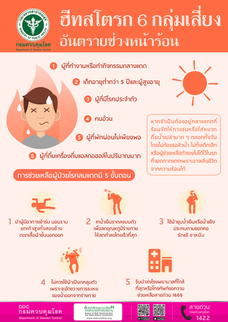 นายแพทย์ณรงค์ สายวงศ์ รองปลัดกระทรวงสาธารณสุข และโฆษกกระทรวงสาธารณสุข ให้สัมภาษณ์ว่า ขณะนี้ประเทศไทยได้เข้าสู่ฤดูร้อนแล้ว ส่งผลให้มีสภาพอากาศร้อนจัด แดดแรง อาจเกิดอาการป่วยได้ง่าย พบอาการได้ตั้งแต่อาการเล็กน้อย เช่น ผื่น ผดแดด บวมแดด ตะคริวแดด การเกร็งจากแดด ส่วนอาการที่รุนแรงพบได้ เช่น เพลียแดด ภาวะขาดน้ำที่เสี่ยงต่อการเกิดโรคลมแดดหรือฮีทสโตรก (Heat Stroke) โดยจะมีอาการอ่อนเพลีย คลื่นไส้อาเจียน ไม่มีเหงื่อออก ตัวร้อนจัด ปวดศีรษะ ชีพจรเต้นเร็ว ความดันโลหิตลดลง และอาจทำให้เสียชีวิตได้ทันทีหากได้รับความร้อนมากเกินไป และไม่ได้รับการช่วยเหลืออย่างถูกวิธี
