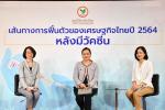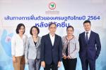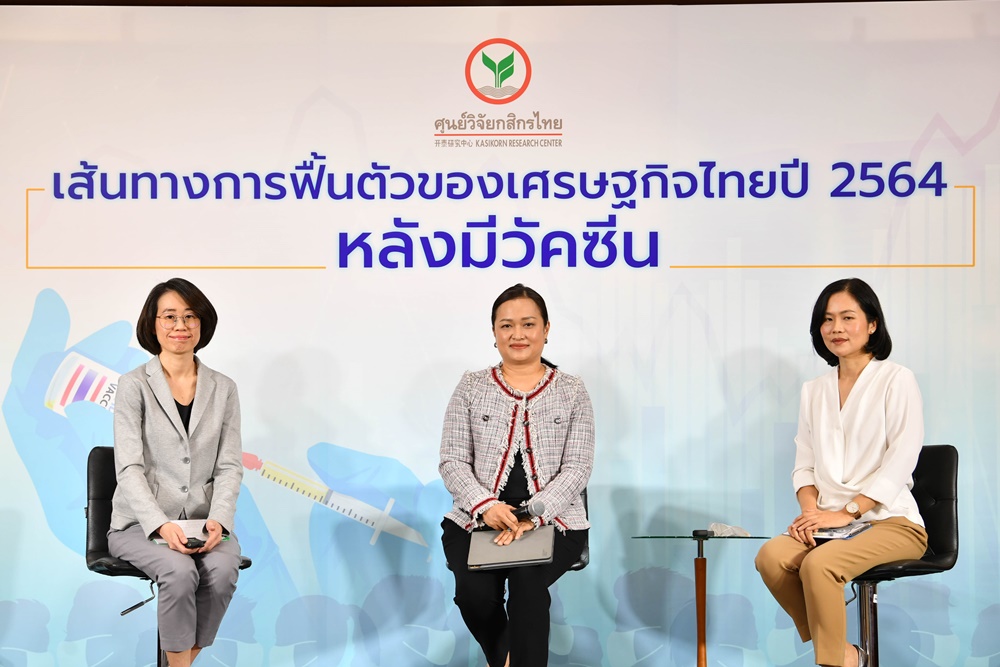 ดร.เชาว์ เก่งชน (กลาง) ประธานกรรมการบริหาร พร้อมด้วย นางสาวธัญญลักษณ์ วัชระชัยสุรพล (ที่ 2 จากขวา) รองกรรมการผู้จัดการ ดร.ศิวัสน์ เหลืองสมบูรณ์ (ขวา) รองกรรมการผู้จัดการ นางสาวเกวลิน หวังพิชญสุข (ที่ 2 จากซ้าย) ผู้ช่วยกรรมการผู้จัดการ นางสาวณัฐพร ตรีรัตน์ศิริกุล (ซ้าย) ผู้ช่วยกรรมการผู้จัดการ บริษัท ศูนย์วิจัยกสิกรไทย จำกัด เผยมุมมองเศรษฐกิจในงานแถลงข่าวประจำไตรมาสที่ 1 ปี 2564 คงประมาณการอัตราการเติบโตของเศรษฐกิจไทยไว้ที่ 2.6% ในกรณีพื้นฐาน แต่ปรับกรอบประมาณการจากเดิมที่ 0.0-4.5% มาที่ 0.8%-3.0% ขึ้นอยู่กับการกระจายวัคซีนและแนวทางเปิดรับนักท่องเที่ยวเป็นสำคัญ ณ ธนาคารกสิกรไทย อาคารพหลโยธิน เมื่อเร็ว ๆ นี้