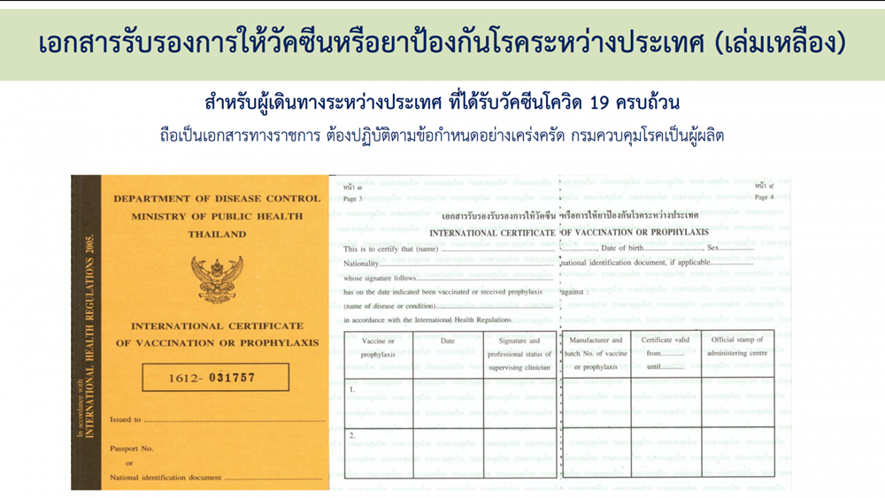 นพ.จักรรัฐกล่าวต่อว่า สำหรับผู้รับวัคซีนโควิด 19 ครบถ้วนจะได้รับใบรับรองการฉีดวัคซีน หากมีความจำเป็นต้องเดินทางระหว่างประเทศ สามารถนำใบรับรองการฉีดวัคซีนไปสถานพยาบาลที่ฉีดวัคซีนเพื่อออกเอกสารรับรอง (สมุดเล่มเหลือง) หรือวัคซีนพาสปอร์ต พร้อมรายละเอียดครบถ้วน โดยสามารถออกเอกสารเป็นภาษาต่างประเทศที่ประเทศปลายทางกำหนด เพื่อเป็นมาตรฐานสากลเทียบเคียงกับองค์การอนามัยโลกได้