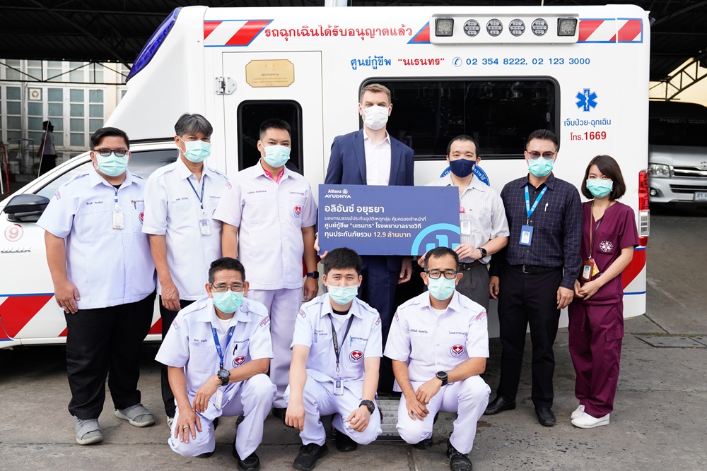 มร.ลาร์ส ไฮบุทสกี้ (กลาง) กรรมการผู้จัดการใหญ่และประธานเจ้าหน้าที่บริหาร บมจ. อลิอันซ์ อยุธยา ประกันภัย มอบกรมธรรม์อุบัติเหตุกลุ่ม คุ้มครองเจ้าหน้าที่ ศูนย์กู้ชีพ “นเรนทร” โรงพยาบาลราชวิถี จำนวน 129 คน ทุนประกันภัยรวม 12.9 ล้านบาท ต่อเนื่องเป็นปีที่ 5 เพื่อตระหนักถึงความเสียสละ ทุ่มเท ของเจ้าหน้าที่อาสาสมัคร ที่ให้ความข่วยเหลือผู้ป่วยให้ได้รับการรักษาอย่างทันท่วงที และสร้างขวัญกำลังใจ ในการปฏิบัติหน้าที่ต่อไป โดยมี นายแพทย์จิรพงษ์ ศุภเสาวภาคย์ (ที่สามจากขวา) นายแพทย์ชำนาญการ หัวหน้างานสื่อสาร ศูนย์กู้ชีพนเรนทร เป็นผู้รับมอบ ณ ศูนย์กู้ชีพ “นเรนทร” โรงพยาบาลราชวิถี เมื่อเร็วๆนี้