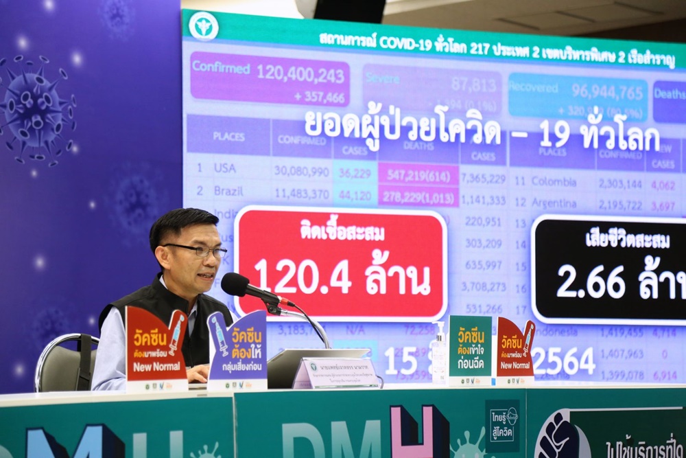 บ่ายวันนี้ (15 มีนาคม 2564) ที่ศูนย์แถลงข่าวสถานการณ์โรคติดเชื้อไวรัสโคโรนา 2019 กระทรวงสาธารณสุข จ.นนทบุรี นายแพทย์เฉวตสรร นามวาท รักษาราชการแทนผู้อำนวยการกองควบคุมโรคและภัยสุขภาพในภาวะฉุกเฉิน กรมควบคุมโรค แถลงข่าวสถานการณ์โรคโควิด 19 ในประเทศไทย ว่า วันนี้ประเทศไทยมีผู้ติดเชื้อรายใหม่ 78 ราย มาจากระบบเฝ้าระวังในโรงพยาบาล 15 ราย ค้นหาเชิงรุกในชุมชน 59 ราย และเดินทางมาจากต่างประเทศ 4 ราย มีผู้เสียชีวิตเพิ่มขึ้น 1 ราย ทำให้การระบาดในระลอกใหม่ ตั้งแต่วันที่ 15 ธันวาคม 2563 - 15 มีนาคม 2564 มีผู้ที่รักษาหายแล้ว 22,057 ราย คิดเป็นร้อยละ96.86 ผู้ป่วยรักษาในโรงพยาบาล 684 ราย เสียชีวิตสะสม 27 ราย โดยผู้เสียชีวิตเป็นชายไทยอายุ 88 ปี อยู่ จ.ปทุมธานี มีโรคประจำตัว คือ ความดันโลหิตสูง ไขมันในเลือดสูง และเนื้องอกในสมอง ตรวจพบเชื้อวันที่ 16 กุมภาพันธ์ 2564 มีอาการเหนื่อย ต้องใช้เครื่องช่วยหายใจ จากนั้นอาการแย่ลงเรื่อยๆ จนไม่ตอบสนองต่อการรักษาและเสียชีวิตวันที่ 13 มีนาคม 2564