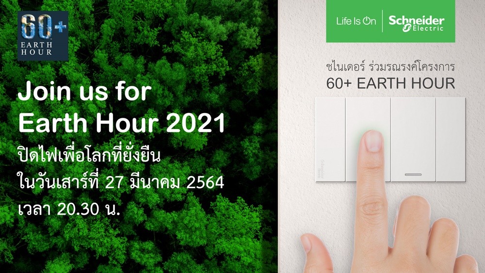 ชไนเดอร์ อิเล็คทริค (Schneider Electric) ผู้นำด้านดิจิทัลทรานส์ฟอร์เมชั่น ด้านการบริหารจัดการพลังงานและระบบออโตเมชั่น โดยล่าสุดได้รับรางวัล องค์กรที่ยั่งยืนที่สุดในโลก ประจำปี 2021 ซึ่งวันนี้เดินหน้าสานต่อสนับสนุนกิจกรรมลดการใช้พลังงาน เอิร์ธอาวเออร์ 2021 (Earth Hour 2021) ซึ่งเป็นแนวคิดของกองทุนสัตว์ป่าโลก (World Wildlife Fund หรือใช้ชื่อย่อว่า WWF) เพื่อลดการใช้พลังงานในช่วงเวลา 1 ชั่วโมง ซึ่งปีนี้ตรงกับวันเสาร์ที่ 27 มีนาคม 2564 เวลา 20.30 – 21.30 น.