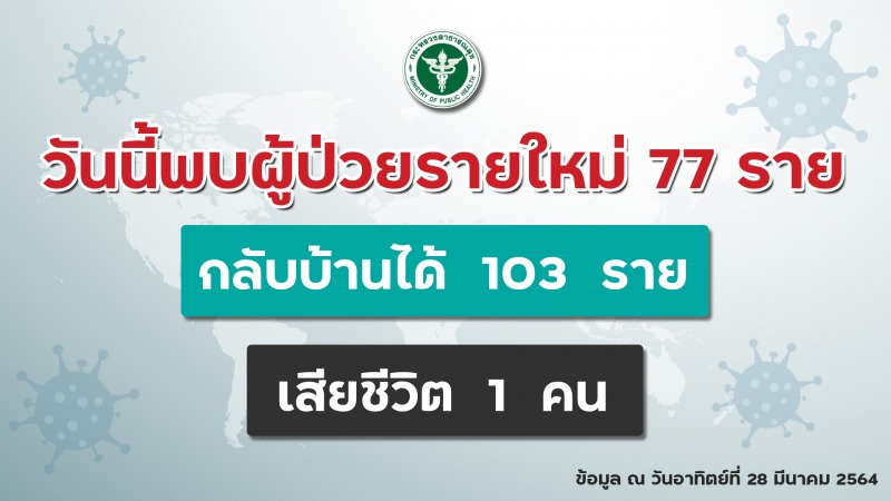วันนี้ (28 มีนาคม 2564) ที่ศูนย์แถลงข่าวสถานการณ์โรคติดเชื้อไวรัสโคโรนา 2019 กระทรวงสาธารณสุข จ.นนทบุรี นพ.โอภาส การย์กวินพงศ์ อธิบดีกรมควบคุมโรค แถลงสถานการณ์โรคโควิด 19 และประสิทธิภาพของวัคซีนโควิด 19 ว่า วันนี้ประเทศไทยมีผู้ติดเชื้อรายใหม่ 77 ราย มาจากระบบเฝ้าระวังในโรงพยาบาล 32 ราย ค้นหาเชิงรุกในชุมชน 26 ราย มาจากต่างประเทศ 19 ราย เสียชีวิตเพิ่ม 1 ราย รักษาหายเพิ่ม 103 ราย การระบาดระลอกใหม่ตั้งแต่วันที่ 15 ธันวาคม 2563 - 28 มีนาคม 2564 มีผู้รักษาหายแล้ว 23,062 ราย อยู่ระหว่างรักษา 1,401 ราย และเสียชีวิตสะสม 34 ราย โดยผู้เสียชีวิตเป็นหญิงไทยอายุ 75 ปี มีโรคประจำตัวไทรอยด์ ไขมันในเลือดสูง เนื้องอกต่อมใต้สมอง และเป็นผู้ป่วยติดเตียง พักอาศัยใน กทม. มีประวัติสัมผัสกับผู้ป่วยยืนยัน 4 ราย ซึ่งเป็นสมาชิกในครอบครัว